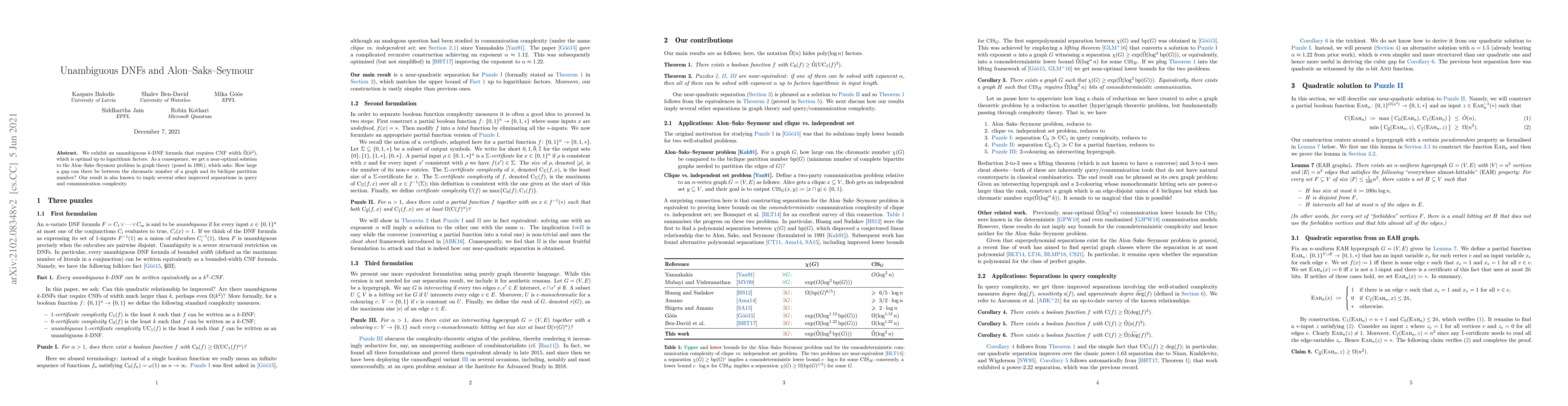 We exhibit an unambiguous k-DNF formula that requires CNF width $\tilde{\Omega}(k^2)$, which is optimal up to logarithmic factors. As a consequence, we get a near-optimal solution to the Alon--Saks--Seymour problem in graph theory (posed in 1991), which asks: How large a gap can there be between the chromatic number of a graph and its biclique partition number? Our result is also known to imply several other improved separations in query and communication complexity.