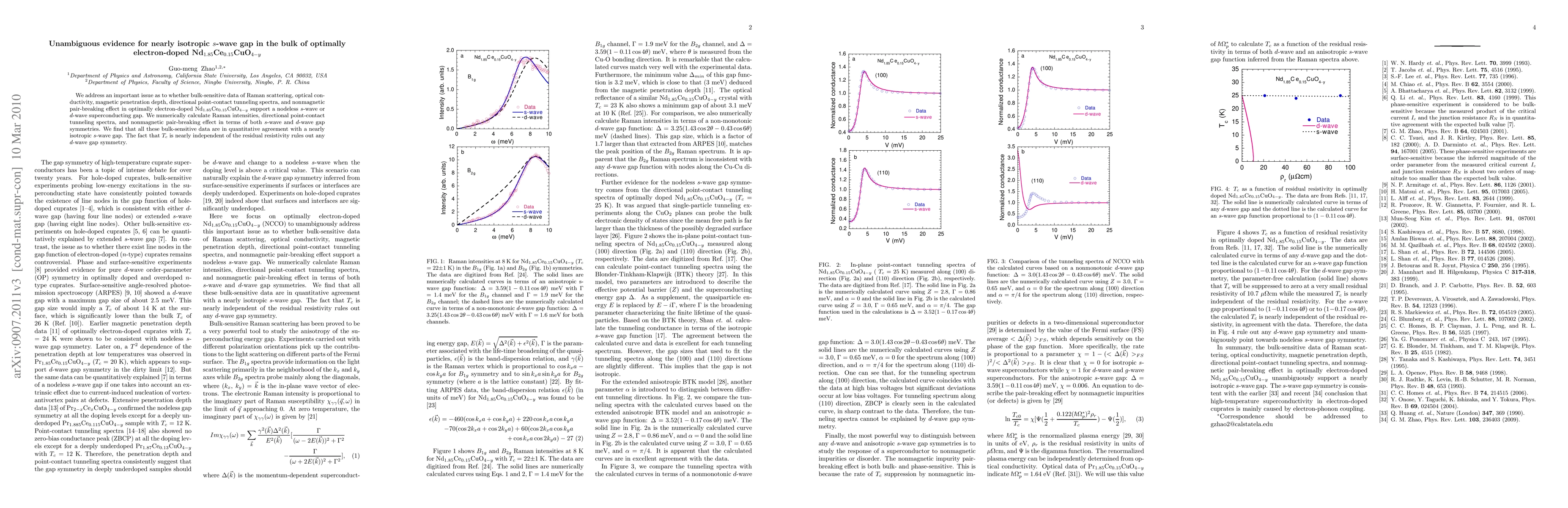The research provides unambiguous evidence for a nearly isotropic s-wave superconducting gap in the bulk of optimally electron-doped Nd_{1.85}Ce_{0.15}CuO_{4-y}. This conclusion is drawn from the agreement of Raman intensities, directional point-contact tunneling spectra, and nonmagnetic pair-breaking effect calculations with s-wave symmetry, and is further supported by the nearly temperature-independent critical temperature (T_c) relative to residual resistivity, which rules out d-wave symmetry.