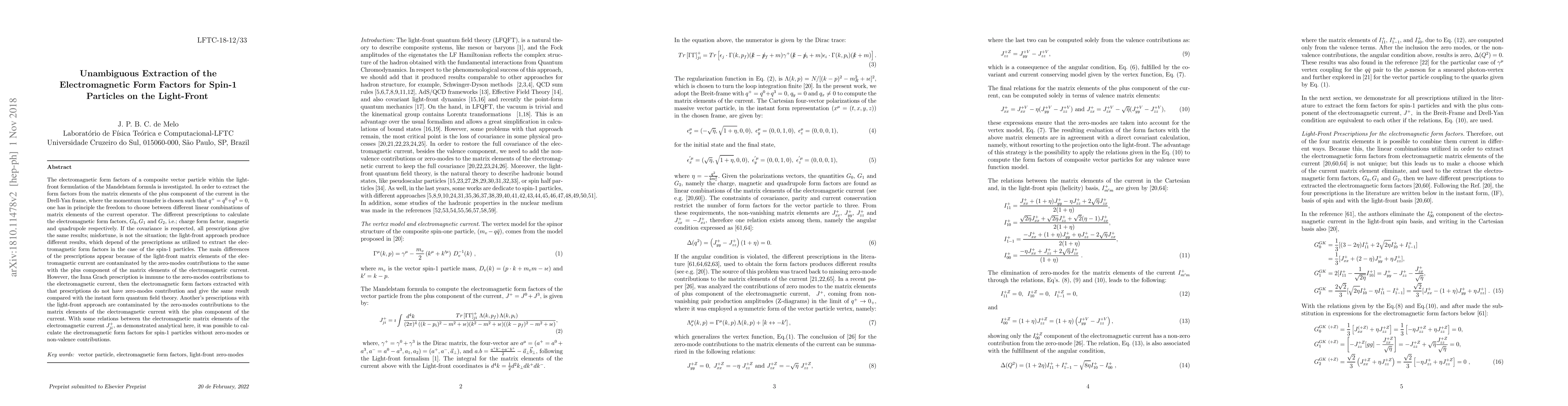 This paper investigates the extraction of electromagnetic form factors for spin-1 particles using the light-front formulation, revealing discrepancies among different extraction methods due to zero-mode contributions. The Inna Grach prescription uniquely avoids these contributions, yielding consistent results with instant form quantum field theory.