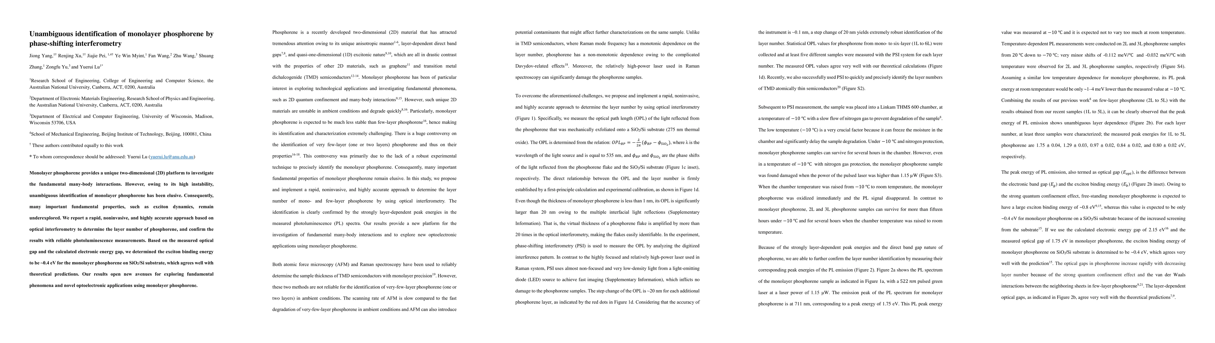 This paper presents a precise optical interferometry method for identifying monolayer phosphorene, overcoming its instability issues, and confirms findings with photoluminescence. The study determines an exciton binding energy of ~0.4 eV, aligning with theoretical predictions, thus paving the way for deeper exploration of phosphorene's fundamental properties.