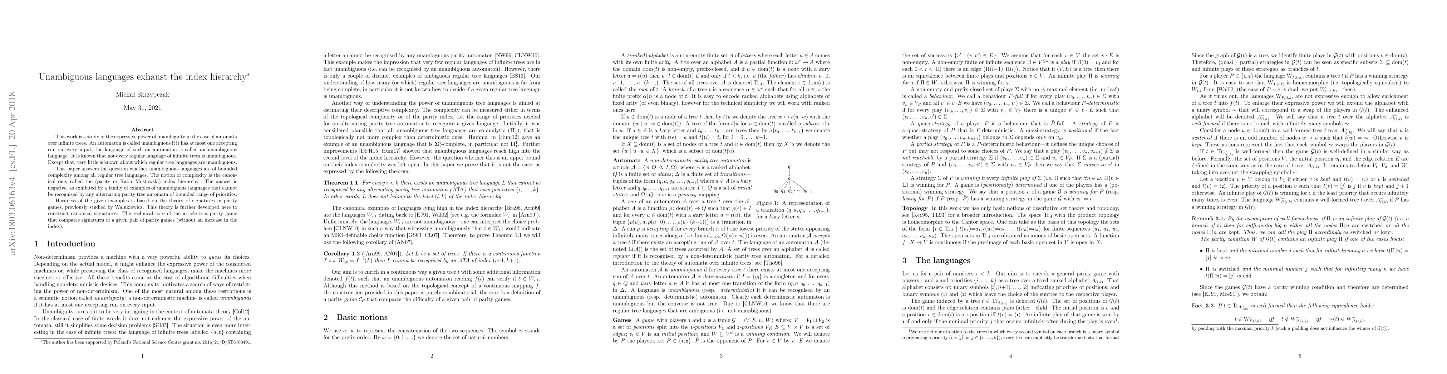 This work is a study of the expressive power of unambiguity in the case of automata over infinite trees. An automaton is called unambiguous if it has at most one accepting run on every input, the language of such an automaton is called an unambiguous language. It is known that not every regular language of infinite trees is unambiguous. Except that, very little is known about which regular tree languages are unambiguous. This paper answers the question whether unambiguous languages are of bounded complexity among all regular tree languages. The notion of complexity is the canonical one, called the (parity or Rabin-Mostowski) index hierarchy. The answer is negative, as exhibited by a family of examples of unambiguous languages that cannot be recognised by any alternating parity tree automata of bounded range of priorities. Hardness of the given examples is based on the theory of signatures in parity games, previously studied by Walukiewicz. This theory is further developed here to construct canonical signatures. The technical core of the article is a parity game that compares signatures of a given pair of parity games (without an increase in the index).