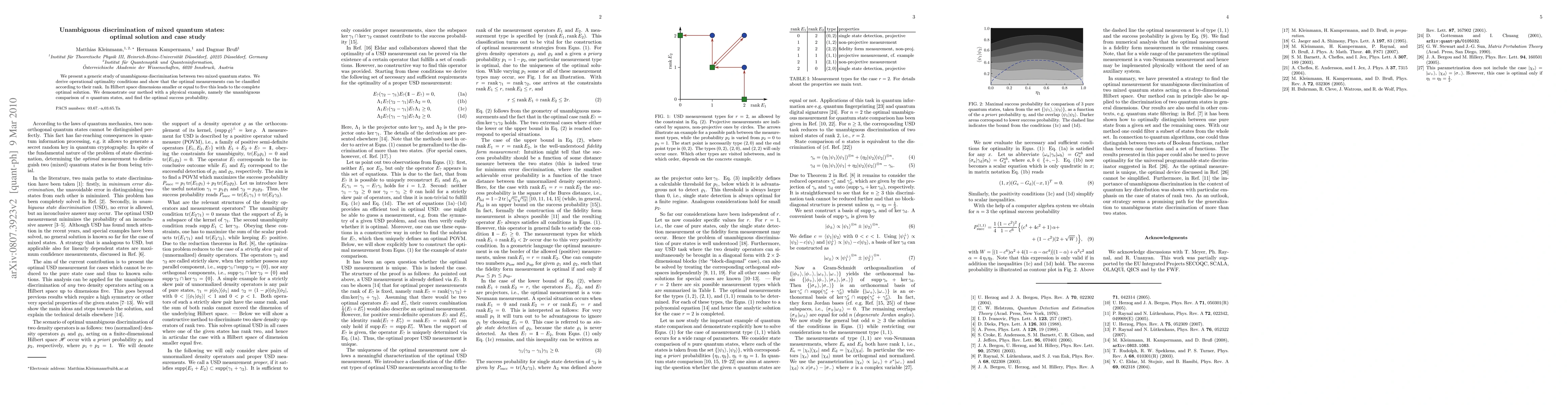 This paper derives optimal conditions for unambiguously distinguishing between two mixed quantum states, providing a complete solution for dimensions up to five. The method is demonstrated through a case study involving the comparison of n quantum states, achieving the highest possible success probability.
