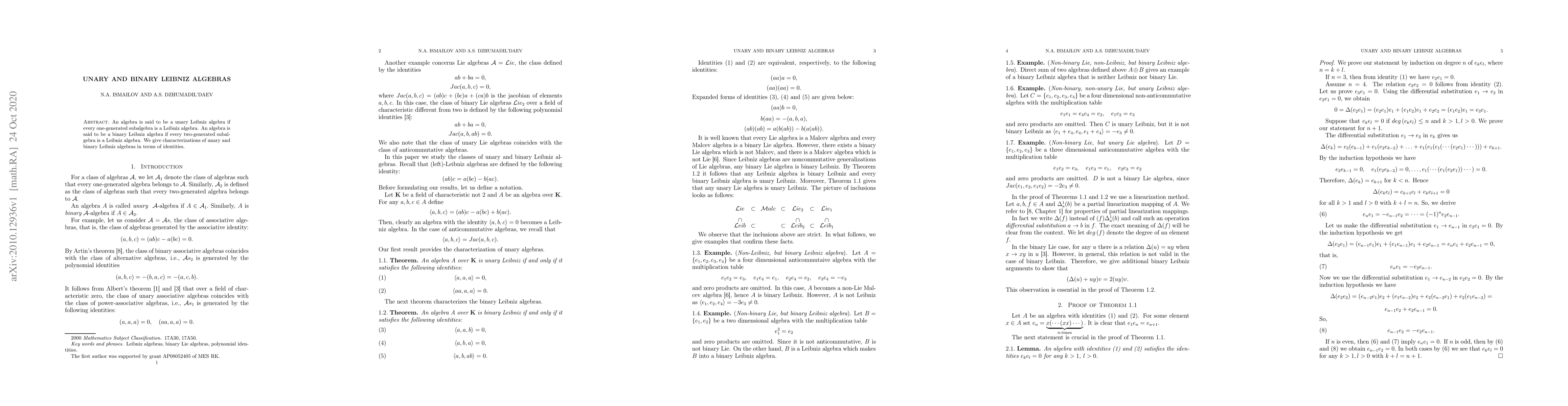 Summary: This paper characterizes unary and binary Leibniz algebras by identifying specific algebraic identities that ensure every one-generated or two-generated subalgebra adheres to the Leibniz algebra properties.