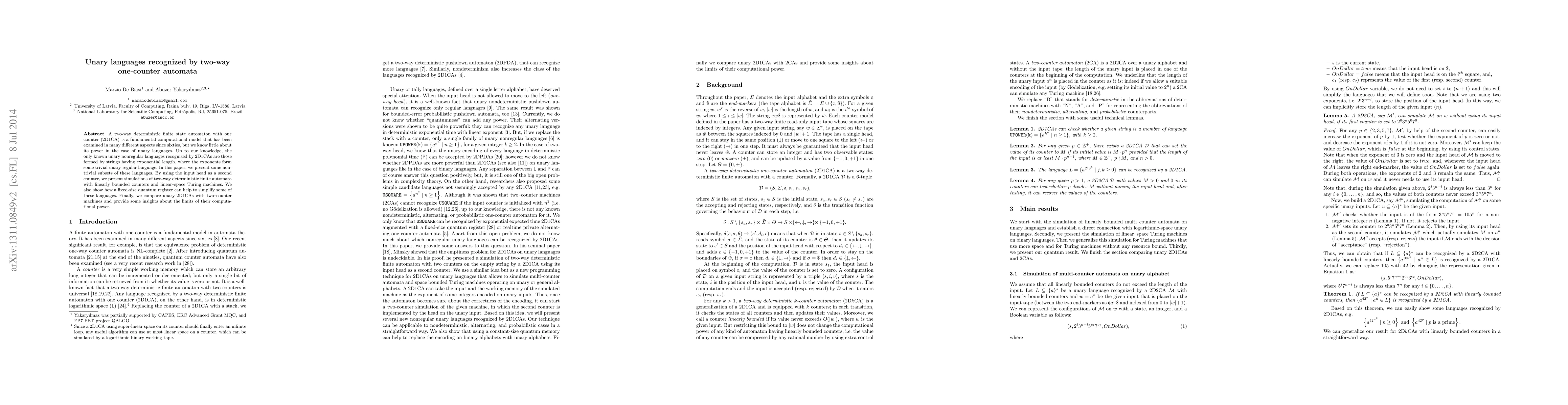 A two-way deterministic finite state automaton with one counter (2D1CA) is a fundamental computational model that has been examined in many different aspects since sixties, but we know little about its power in the case of unary languages. Up to our knowledge, the only known unary nonregular languages recognized by 2D1CAs are those formed by strings having exponential length, where the exponents form some trivial unary regular language. In this paper, we present some non-trivial subsets of these languages. By using the input head as a second counter, we present simulations of two-way deterministic finite automata with linearly bounded counters and linear--space Turing machines. We also show how a fixed-size quantum register can help to simplify some of these languages. Finally, we compare unary 2D1CAs with two--counter machines and provide some insights about the limits of their computational power.