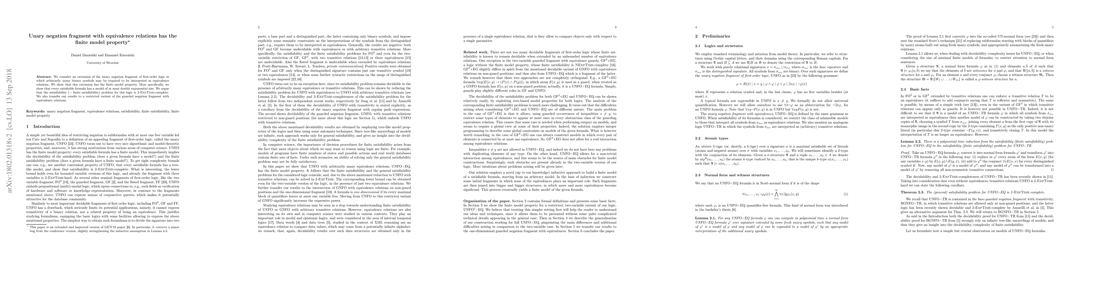We consider an extension of the unary negation fragment of first-order logic in which arbitrarily many binary symbols may be required to be interpreted as equivalence relations. We show that this extension has the finite model property. More specifically, we show that every satisfiable formula has a model of at most doubly exponential size. We argue that the satisfiability (= finite satisfiability) problem for this logic is TwoExpTime-complete. We also transfer our results to a restricted variant of the guarded negation fragment with equivalence relations.