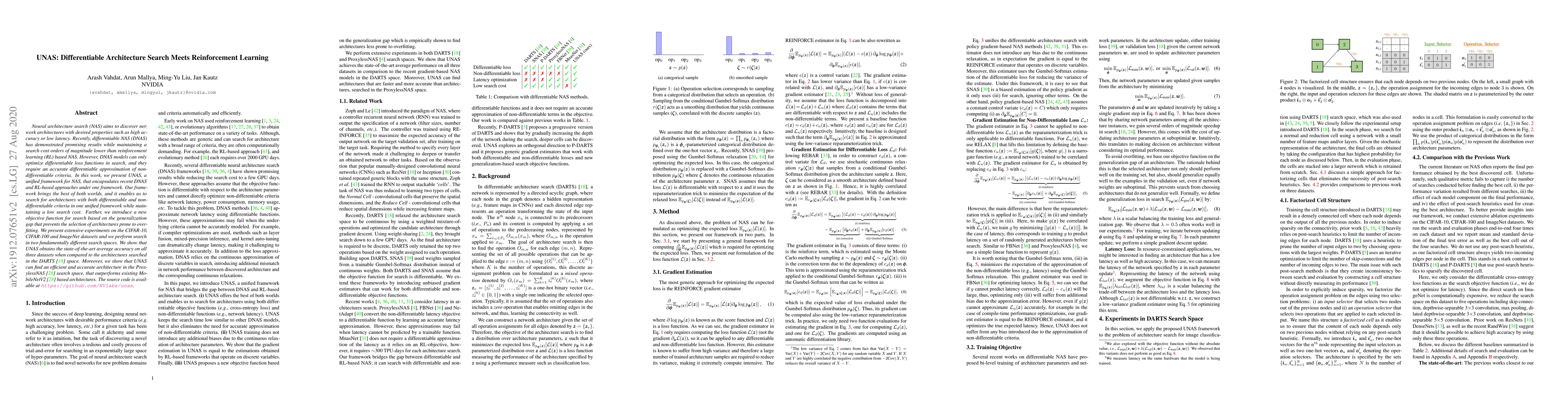 UNAS integrates differentiable and reinforcement learning approaches for neural architecture search, achieving state-of-the-art accuracy on CIFAR and ImageNet datasets while maintaining low search costs and preventing overfitting through a novel generalization gap objective function.