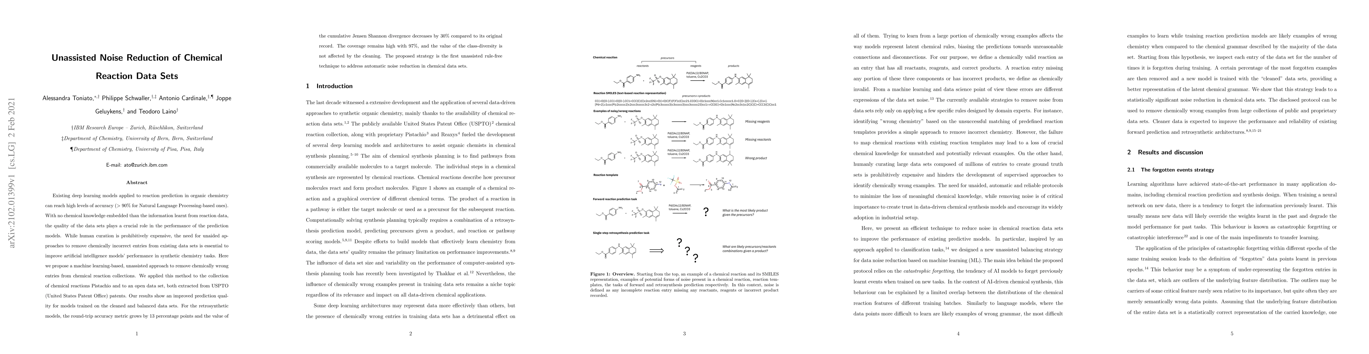 Existing deep learning models applied to reaction prediction in organic chemistry can reach high levels of accuracy (> 90% for Natural Language Processing-based ones). With no chemical knowledge embedded than the information learnt from reaction data, the quality of the data sets plays a crucial role in the performance of the prediction models. While human curation is prohibitively expensive, the need for unaided approaches to remove chemically incorrect entries from existing data sets is essential to improve artificial intelligence models' performance in synthetic chemistry tasks. Here we propose a machine learning-based, unassisted approach to remove chemically wrong entries from chemical reaction collections. We applied this method to the collection of chemical reactions Pistachio and to an open data set, both extracted from USPTO (United States Patent Office) patents. Our results show an improved prediction quality for models trained on the cleaned and balanced data sets. For the retrosynthetic models, the round-trip accuracy metric grows by 13 percentage points and the value of the cumulative Jensen Shannon divergence decreases by 30% compared to its original record. The coverage remains high with 97%, and the value of the class-diversity is not affected by the cleaning. The proposed strategy is the first unassisted rule-free technique to address automatic noise reduction in chemical data sets.