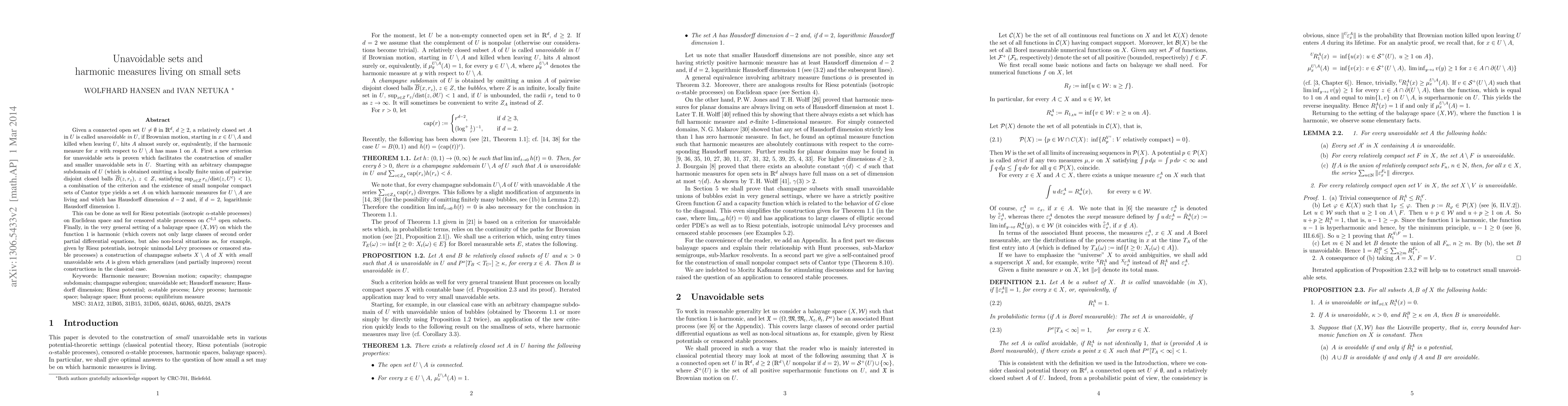 Given a connected open set $U\ne\emptyset$ in $ R^d$, $d\ge 2$, a relatively closed set $A$ in $U$ is called \emph{unavoidable in $U$}, if Brownian motion, starting in $x\in U\setminus A$ and killed when leaving $U$, hits $A$ almost surely or, equivalently, if the harmonic measure for $x$ with respect to $U\setminus A$ has mass $1$ on $A$. First a new criterion for unavoidable sets is proven which facilitates the construction of smaller and smaller unavoidable sets in $U$. Starting with an arbitrary champagne subdomain of $U$ (which is obtained omitting a locally finite union of pairwise disjoint closed balls $\overline B(z, r_z)$, $z\in Z$, satisfying $\sup_{z\in Z} r_z/\mbox{dist}(z,U^c)<1$), a combination of the criterion and the existence of small nonpolar compact sets of Cantor type yields a set $A$ on which harmonic measures for $U\setminus A$ are living and which has Hausdorff dimension $d-2$ and, if $d=2$, logarithmic Hausdorff dimension $1$. This can be done as well for Riesz potentials (isotropic $\alpha$-stable processes) on Euclidean space and for censored stable processes on $C^{1,1}$ open subsets. Finally, in the very general setting of a balayage space $(X,\mathcal W)$ on which the function $1$ is harmonic (which covers not only large classes of second order partial differential equations, but also non-local situations as, for example, given by Riesz potentials, isotropic unimodal L\'evy processes or censored stable processes) a construction of champagne subsets $X\setminus A$ of $X$ with small unavoidable sets $A$ is given which generalizes (and partially improves) recent constructions in the classical case.