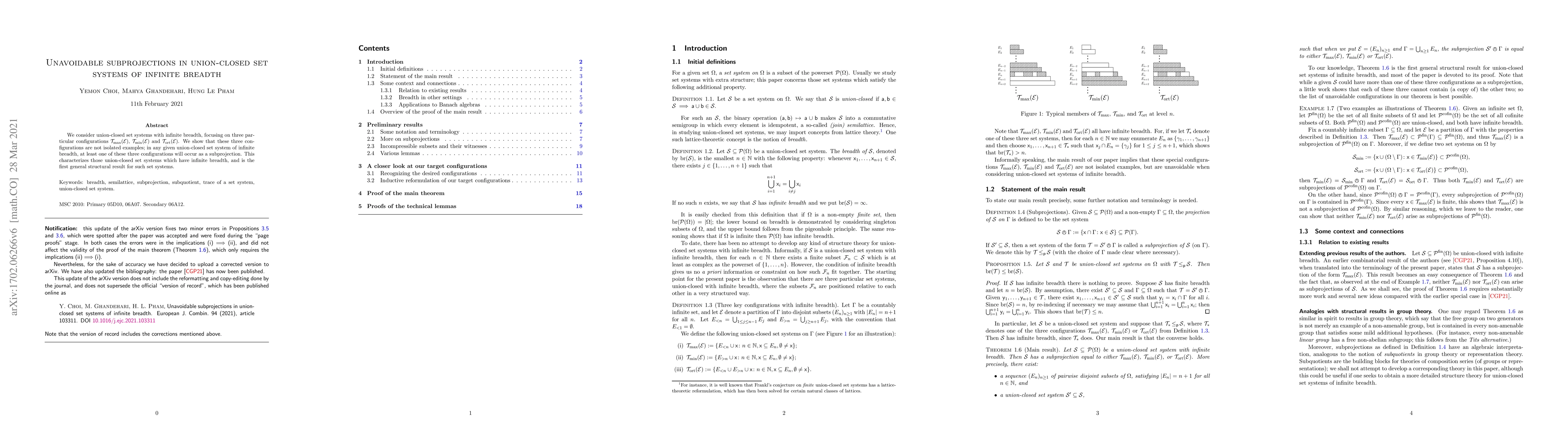 We consider union-closed set systems with infinite breadth, focusing on three particular configurations ${\mathcal T}_{\rm max}(E)$, ${\mathcal T}_{\rm min}(E)$ and ${\mathcal T}_{\rm ort}(E)$. We show that these three configurations are not isolated examples; in any given union-closed set system of infinite breadth, at least one of these three configurations will occur as a subprojection. This characterizes those union-closed set systems which have infinite breadth, and is the first general structural result for such set systems.