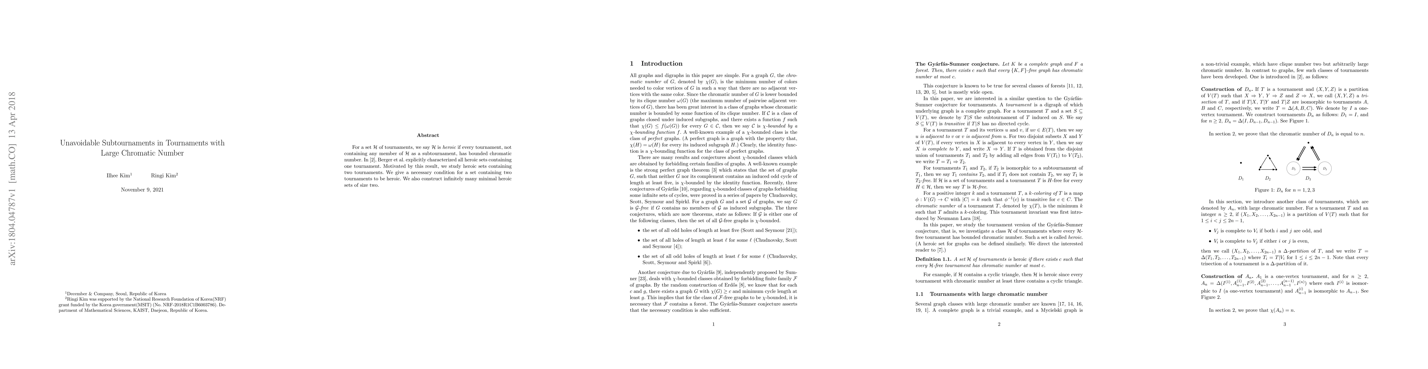 Researchers studied heroic sets of two tournaments in graph theory, finding necessary conditions and constructing infinite examples, with implications for understanding tournament chromatic numbers.