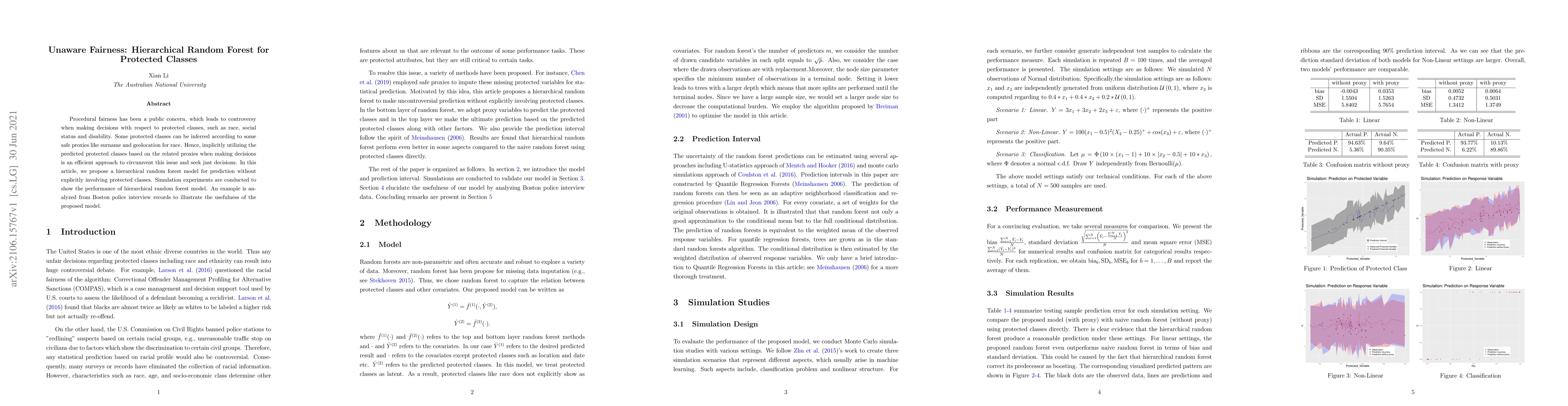 Procedural fairness has been a public concern, which leads to controversy when making decisions with respect to protected classes, such as race, social status, and disability. Some protected classes can be inferred according to some safe proxies like surname and geolocation for the race. Hence, implicitly utilizing the predicted protected classes based on the related proxies when making decisions is an efficient approach to circumvent this issue and seek just decisions. In this article, we propose a hierarchical random forest model for prediction without explicitly involving protected classes. Simulation experiments are conducted to show the performance of the hierarchical random forest model. An example is analyzed from Boston police interview records to illustrate the usefulness of the proposed model.