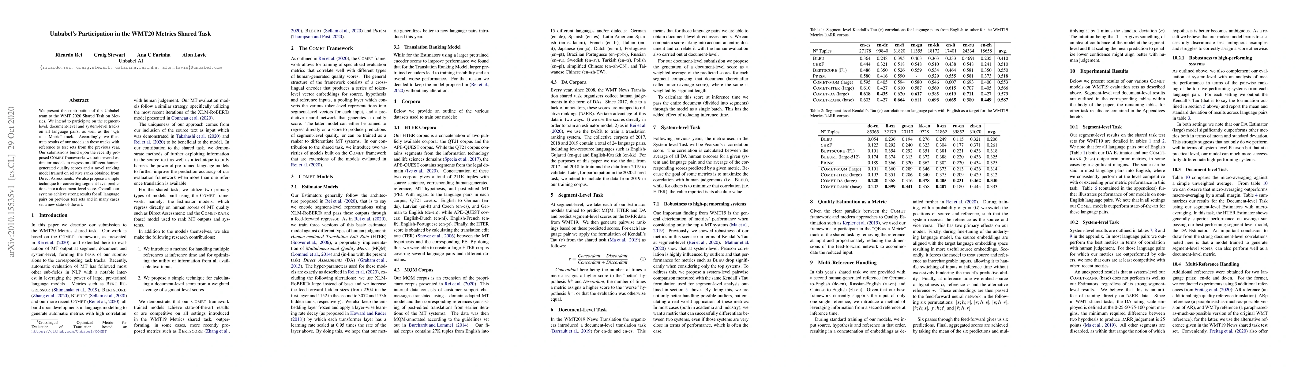 We present the contribution of the Unbabel team to the WMT 2020 Shared Task on Metrics. We intend to participate on the segment-level, document-level and system-level tracks on all language pairs, as well as the 'QE as a Metric' track. Accordingly, we illustrate results of our models in these tracks with reference to test sets from the previous year. Our submissions build upon the recently proposed COMET framework: We train several estimator models to regress on different human-generated quality scores and a novel ranking model trained on relative ranks obtained from Direct Assessments. We also propose a simple technique for converting segment-level predictions into a document-level score. Overall, our systems achieve strong results for all language pairs on previous test sets and in many cases set a new state-of-the-art.