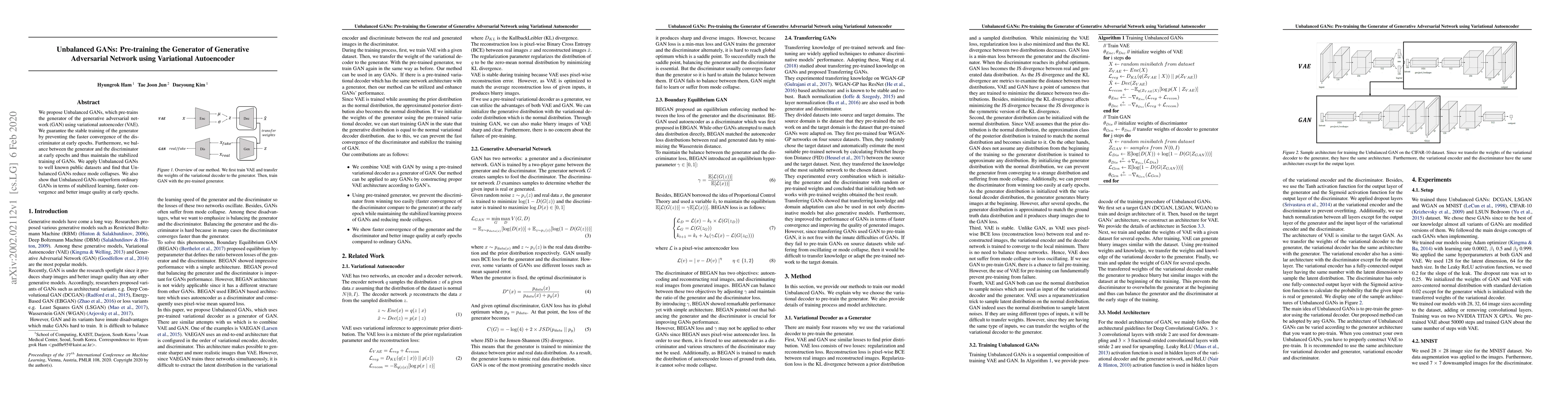 Unbalanced GANs pre-train the generator using a variational autoencoder to stabilize training and prevent faster discriminator convergence. This approach reduces mode collapse and outperforms ordinary GANs in stabilized learning, faster convergence, and better image quality.