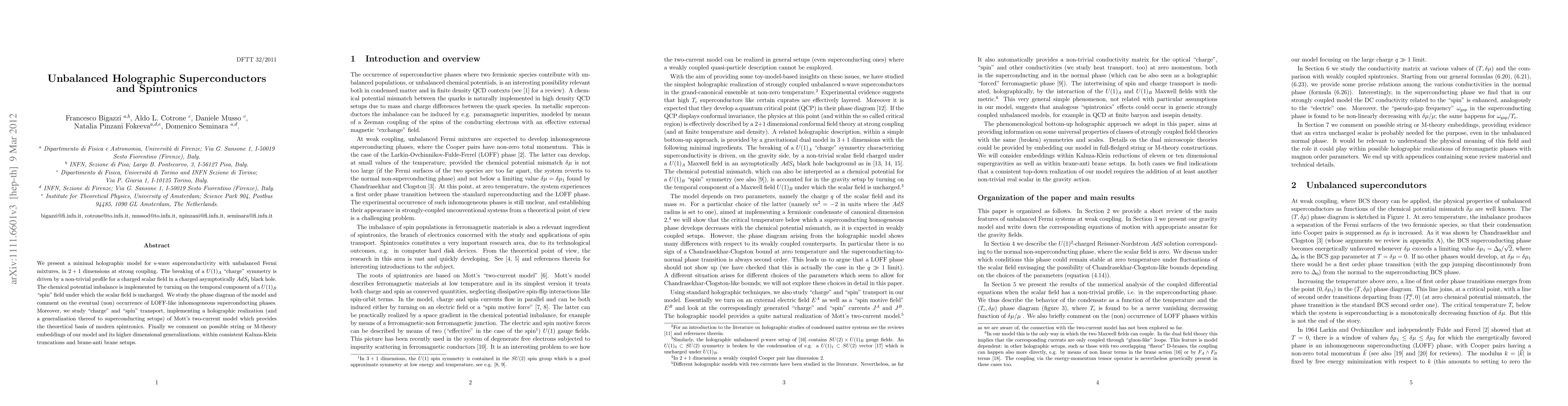 We present a minimal holographic model for s-wave superconductivity with unbalanced Fermi mixtures, in 2+1 dimensions at strong coupling. The breaking of a U(1)_A "charge" symmetry is driven by a non-trivial profile for a charged scalar field in a charged asymptotically AdS_4 black hole. The chemical potential imbalance is implemented by turning on the temporal component of a U(1)_B "spin" field under which the scalar field is uncharged. We study the phase diagram of the model and comment on the eventual (non) occurrence of LOFF-like inhomogeneous superconducting phases. Moreover, we study "charge" and "spin" transport, implementing a holographic realization (and a generalization thereof to superconducting setups) of Mott's two-current model which provides the theoretical basis of modern spintronics. Finally we comment on possible string or M-theory embeddings of our model and its higher dimensional generalizations, within consistent Kaluza-Klein truncations and brane-anti brane setups.