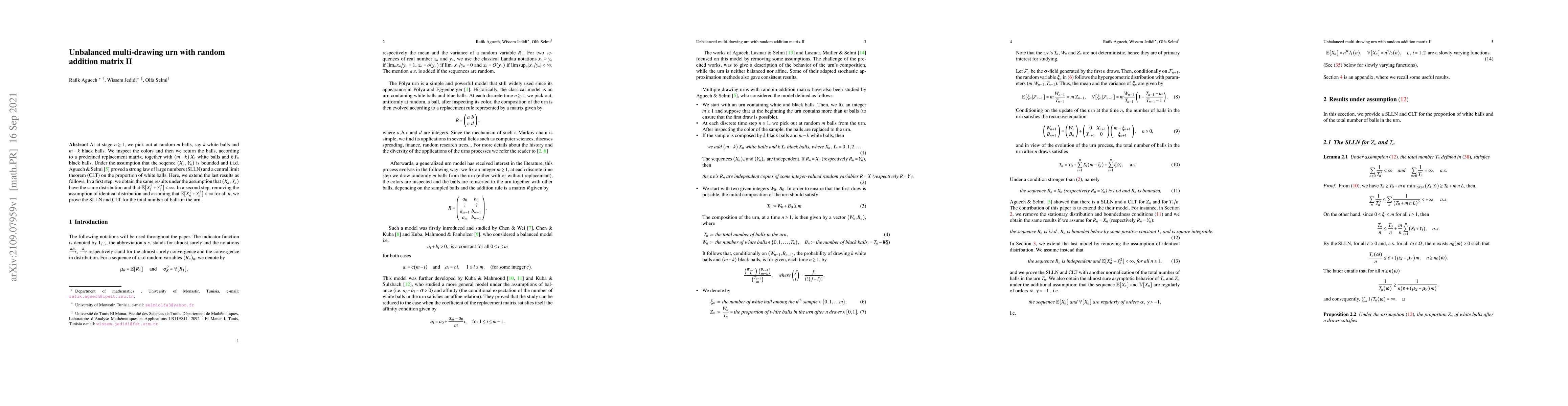 Summary: This paper extends the Polya urn model with two colors, analyzing the Law of Large Numbers (SLLN) and Central Limit Theorem (CLT) concerning the proportion of white balls, incorporating a random addition matrix.