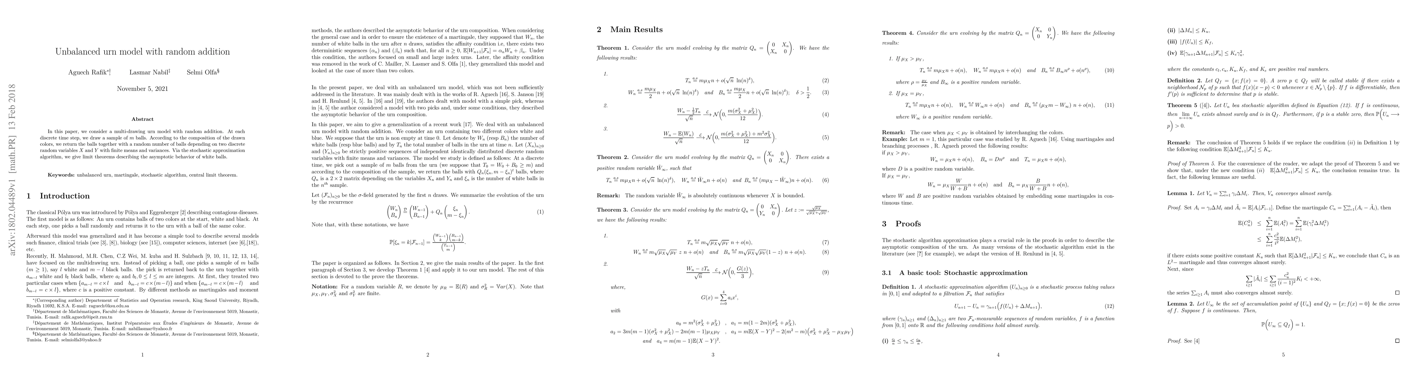 This paper studies a multi-drawing urn model where balls are drawn and returned with a random number of additional balls, based on two discrete random variables. The study uses stochastic approximation to derive limit theorems for the asymptotic behavior of white balls.