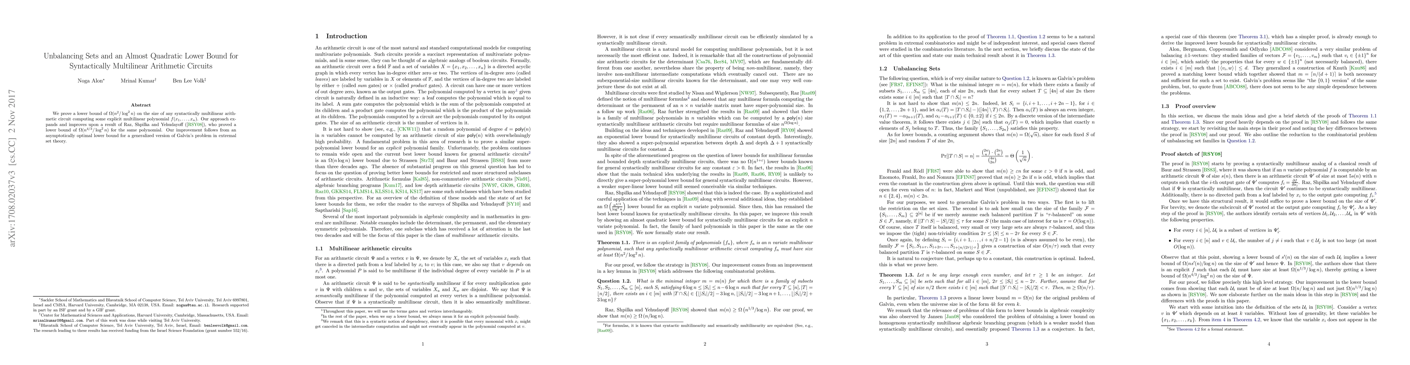 We prove a lower bound of $\Omega(n^2/\log^2 n)$ on the size of any syntactically multilinear arithmetic circuit computing some explicit multilinear polynomial $f(x_1, \ldots, x_n)$. Our approach expands and improves upon a result of Raz, Shpilka and Yehudayoff ([RSY08]), who proved a lower bound of $\Omega(n^{4/3}/\log^2 n)$ for the same polynomial. Our improvement follows from an asymptotically optimal lower bound for a generalized version of Galvin's problem in extremal set theory.