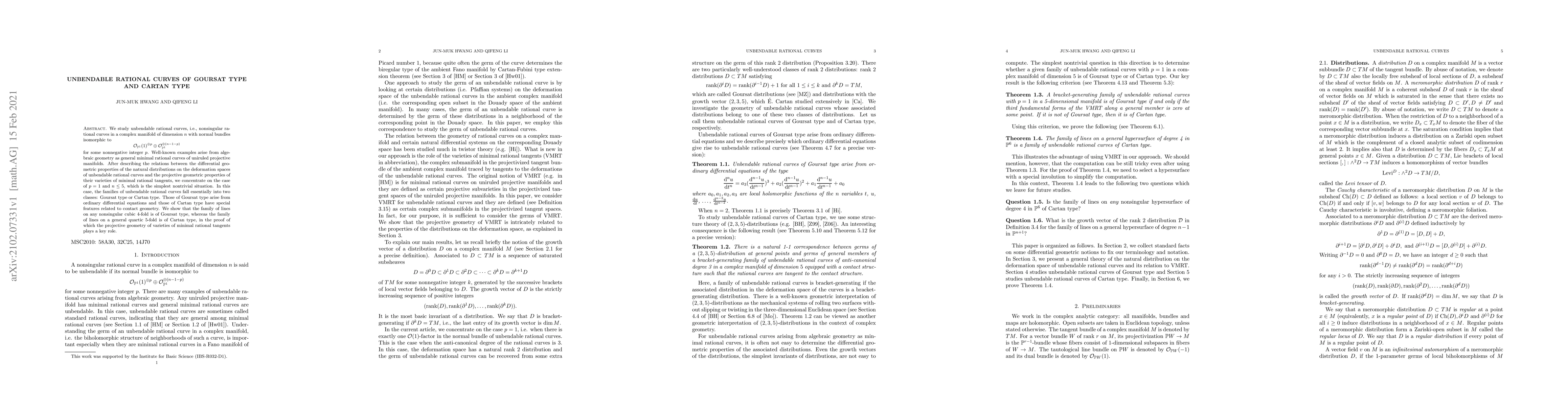 We study unbendable rational curves, i.e., nonsingular rational curves in a complex manifold of dimension $n$ with normal bundles isomorphic to $\mathcal{O}_{\mathbb{P}^1}(1)^{\oplus p} \oplus \mathcal{O}_{\mathbb{P}^1}^{\oplus (n-1-p)}$ for some nonnegative integer $p$. Well-known examples arise from algebraic geometry as general minimal rational curves of uniruled projective manifolds. After describing the relations between the differential geometric properties of the natural distributions on the deformation spaces of unbendable rational curves and the projective geometric properties of their varieties of minimal rational tangents, we concentrate on the case of $p=1$ and $n \leq 5$, which is the simplest nontrivial situation. In this case, the families of unbendable rational curves fall essentially into two classes: Goursat type or Cartan type. Those of Goursat type arise from ordinary differential equations and those of Cartan type have special features related to contact geometry. We show that the family of lines on any nonsingular cubic 4-fold is of Goursat type, whereas the family of lines on a general quartic 5-fold is of Cartan type, in the proof of which the projective geometry of varieties of minimal rational tangents plays a key role.