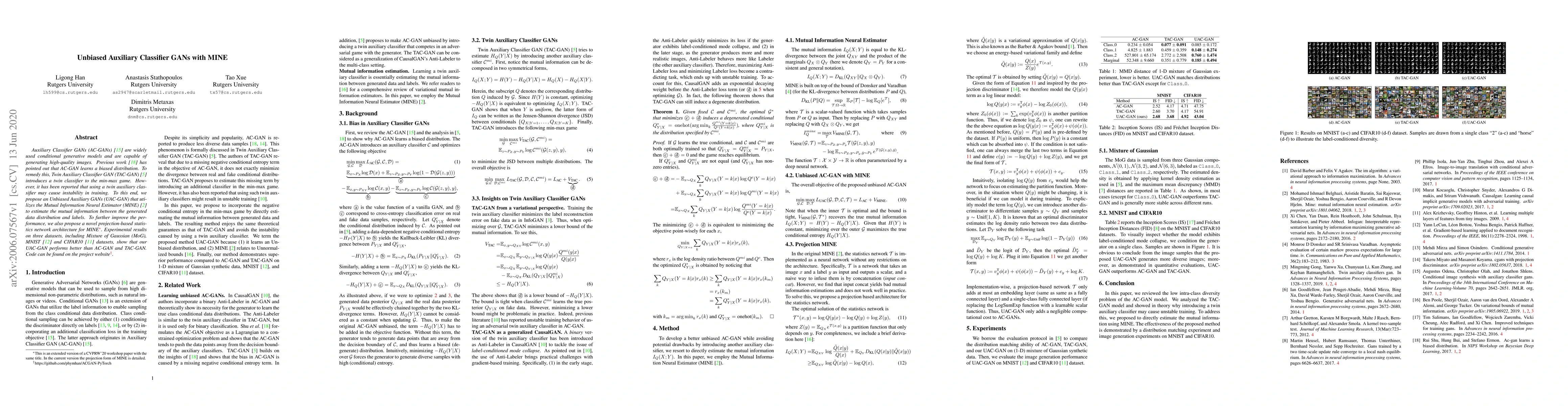 This paper proposes an Unbiased Auxiliary Classifier GAN (UAC-GAN) that uses the Mutual Information Neural Estimator (MINE) to address the bias in AC-GANs. It also introduces a new projection-based network architecture for MINE, demonstrating improved performance over AC-GAN and TAC-GAN on three datasets.