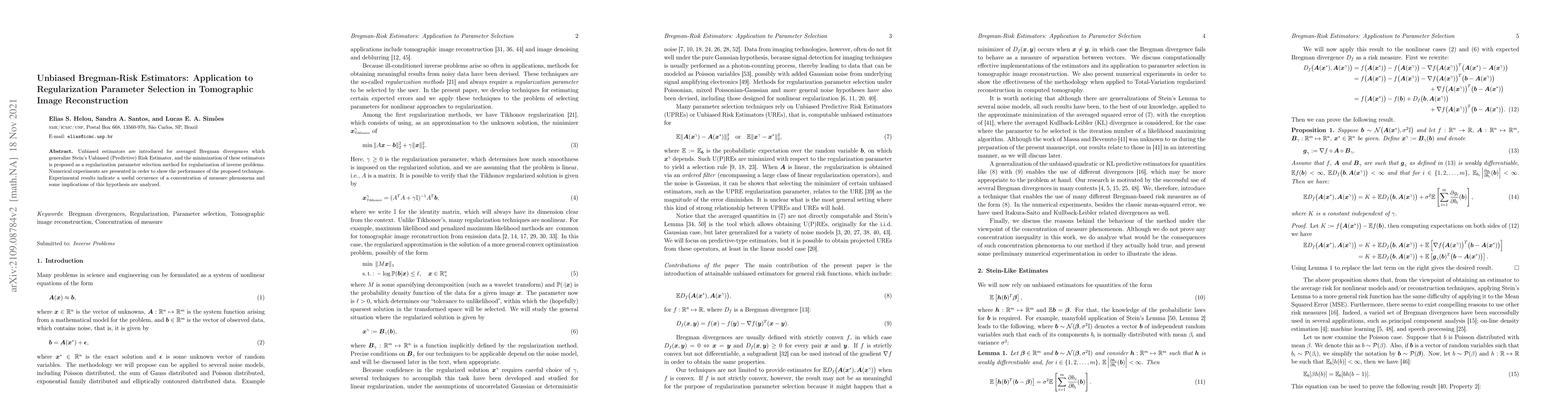 This paper introduces unbiased estimators for averaged Bregman divergences, extending Stein's Unbiased Risk Estimator, and proposes their minimization for selecting regularization parameters in tomographic image reconstruction. Numerical experiments demonstrate the effectiveness of the method, highlighting a concentration of measure phenomenon.
