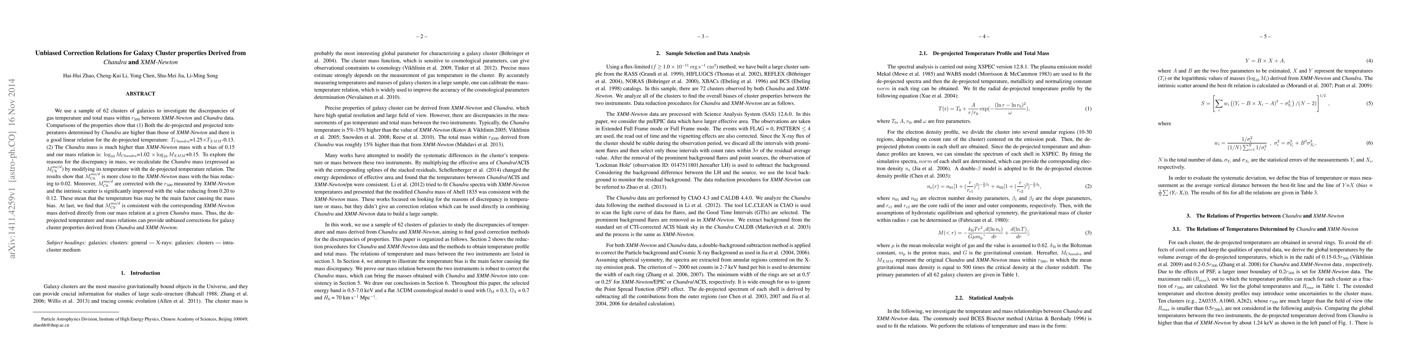 We use a sample of 62 clusters of galaxies to investigate the discrepancies of gas temperature and total mass within r500 between XMM-Newton and Chandra data. Comparisons of the properties show that: (1) Both the de-projected and projected temperatures determined by Chandra are higher than those of XMM-Newton and there is a good linear relation for the de-projected temperature. (2) The Chandra mass is much higher than XMM-Newton mass with a bias of 0.15. To explore the reasons for the discrepancy in mass, we recalculate the Chandra mass (expressed as M_c) by modifying its temperature with the de-projected temperature relation. The results show that M_c is more close to the XMM-Newton mass with the bias reducing to 0.02. Moreover, M_c are corrected with the r500 measured by XMM-Newton and the intrinsic scatter is significantly improved with the value reducing from 0.20 to 0.12. These mean that the temperature bias may be the main factor causing the mass bias. At last, we find that M_c is consistent with the corresponding XMM-Newton mass derived directly from our mass relation at a given Chandra mass. Thus, the de-projected temperature and mass relations can provide unbiased corrections for galaxy cluster properties derived from Chandra and XMM-Newton.