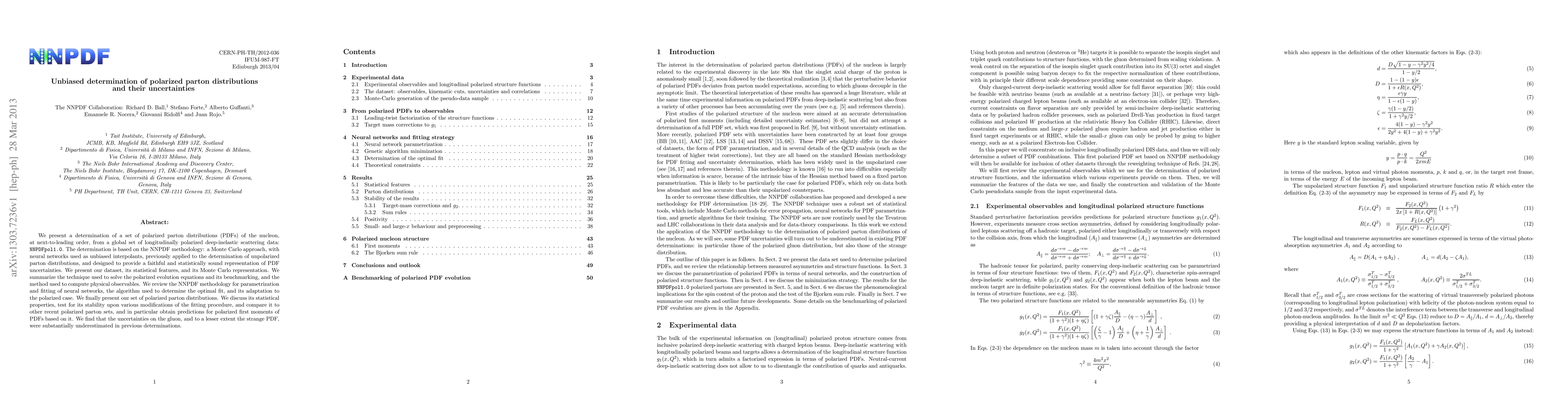 This paper presents a new set of polarized parton distribution functions (NNPDFpol1.0) for the nucleon, determined using the NNPDF methodology and a global dataset of longitudinally polarized deep-inelastic scattering data. The study highlights substantial underestimations in uncertainties for the gluon and strange PDFs compared to previous determinations.