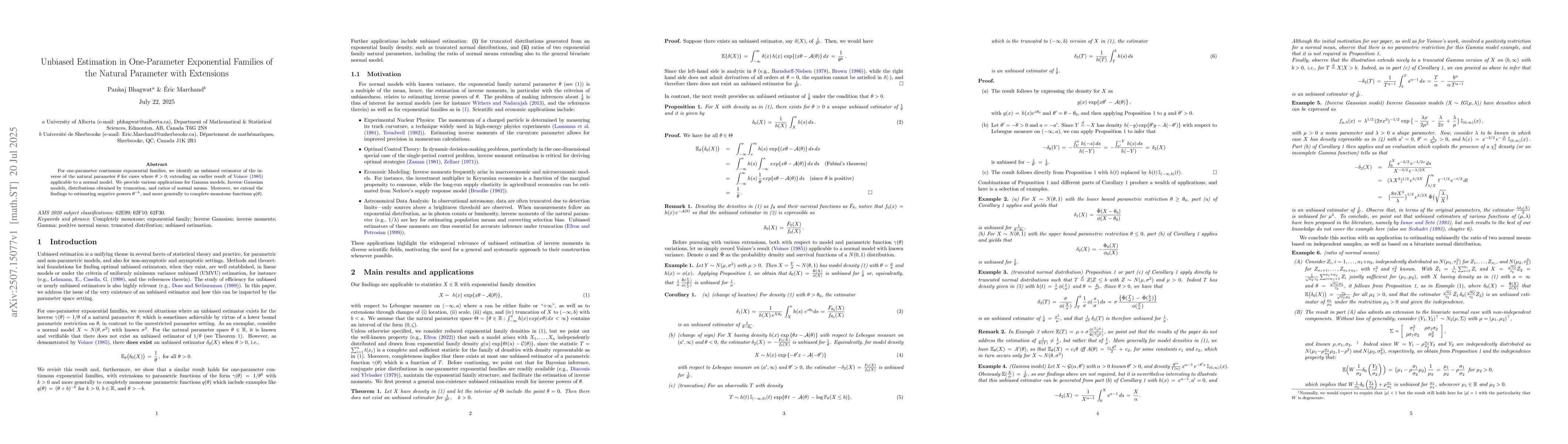 For one-parameter continuous exponential families, we identify an unbiased estimator of the inverse of the natural parameter $\theta$ for cases where $\theta > 0$, extending an earlier result of \cite{voinov1985unbiased} applicable to a normal model. We provide various applications for Gamma models, Inverse Gaussian models, distributions obtained by truncation, and ratios of normal means. Moreover, we extend the findings to estimating negative powers $\theta^{-k}$, and more generally to complete monotone functions $q(\theta)$.