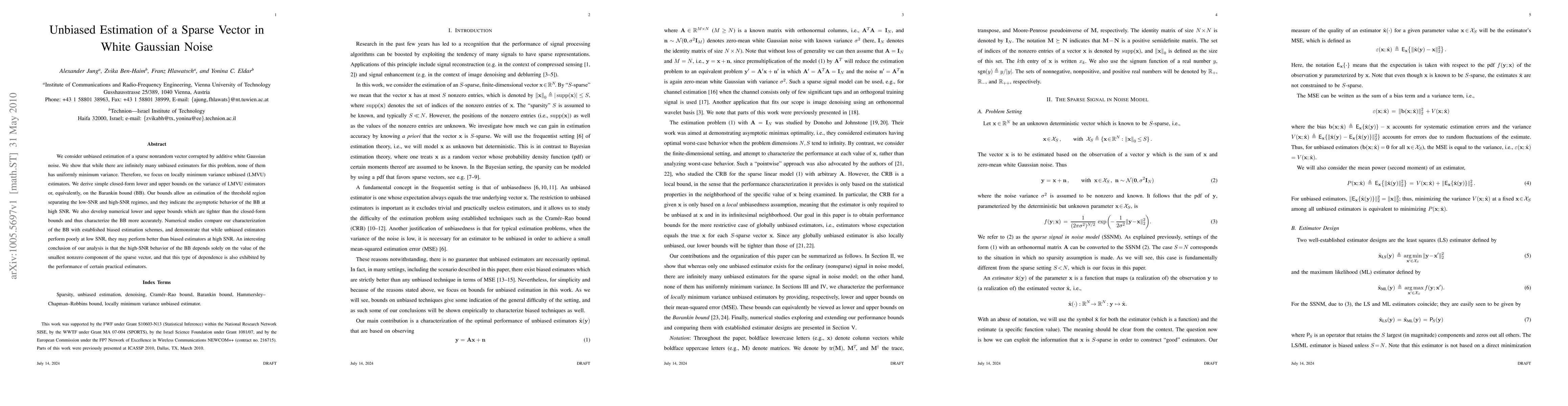 This paper investigates unbiased estimation of sparse vectors in white Gaussian noise, finding that while many unbiased estimators exist, none has uniformly minimum variance. It focuses on locally minimum variance unbiased estimators, deriving bounds on their variance and demonstrating that unbiased estimators may outperform biased ones at high SNR, with high-SNR performance depending on the smallest nonzero component of the sparse vector.