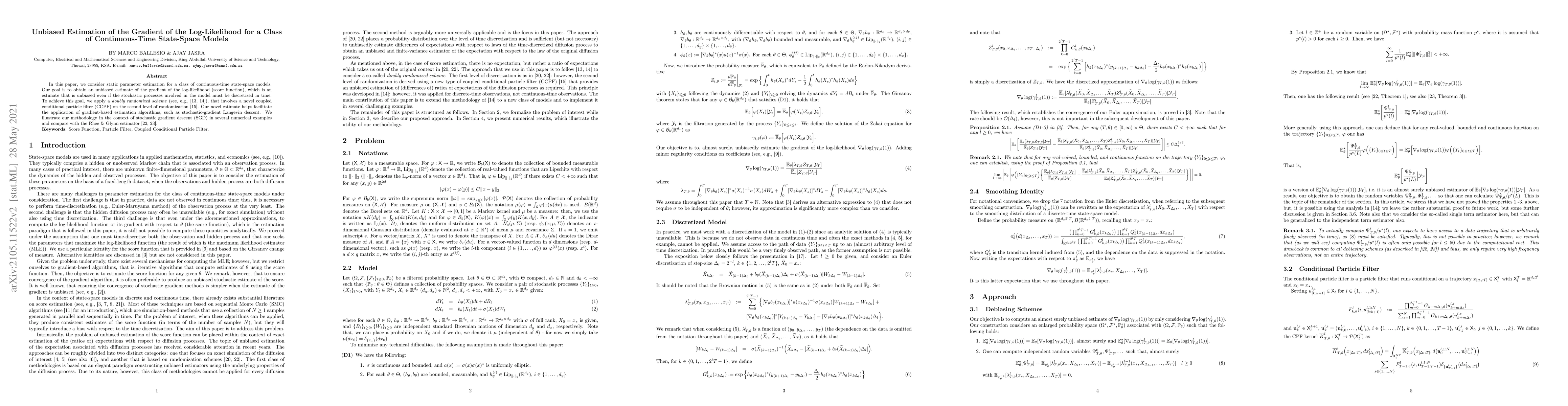 In this paper, we consider static parameter estimation for a class of continuous-time state-space models. Our goal is to obtain an unbiased estimate of the gradient of the log-likelihood (score function), which is an estimate that is unbiased even if the stochastic processes involved in the model must be discretized in time. To achieve this goal, we apply a doubly randomized scheme, that involves a novel coupled conditional particle filter (CCPF) on the second level of randomization. Our novel estimate helps facilitate the application of gradient-based estimation algorithms, such as stochastic-gradient Langevin descent. We illustrate our methodology in the context of stochastic gradient descent (SGD) in several numerical examples and compare with the Rhee & Glynn estimator.