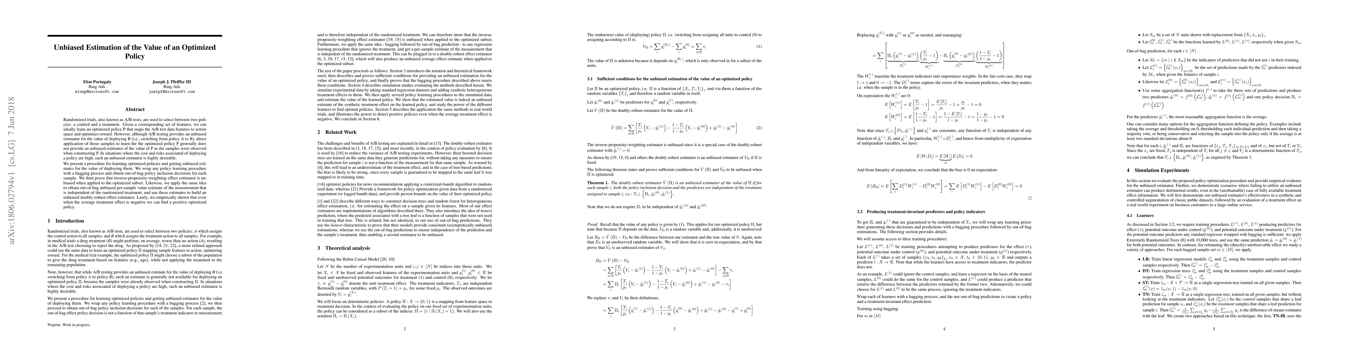 Randomized trials, also known as A/B tests, are used to select between two policies: a control and a treatment. Given a corresponding set of features, we can ideally learn an optimized policy P that maps the A/B test data features to action space and optimizes reward. However, although A/B testing provides an unbiased estimator for the value of deploying B (i.e., switching from policy A to B), direct application of those samples to learn the the optimized policy P generally does not provide an unbiased estimator of the value of P as the samples were observed when constructing P. In situations where the cost and risks associated of deploying a policy are high, such an unbiased estimator is highly desirable. We present a procedure for learning optimized policies and getting unbiased estimates for the value of deploying them. We wrap any policy learning procedure with a bagging process and obtain out-of-bag policy inclusion decisions for each sample. We then prove that inverse-propensity-weighting effect estimator is unbiased when applied to the optimized subset. Likewise, we apply the same idea to obtain out-of-bag unbiased per-sample value estimate of the measurement that is independent of the randomized treatment, and use these estimates to build an unbiased doubly-robust effect estimator. Lastly, we empirically shown that even when the average treatment effect is negative we can find a positive optimized policy.