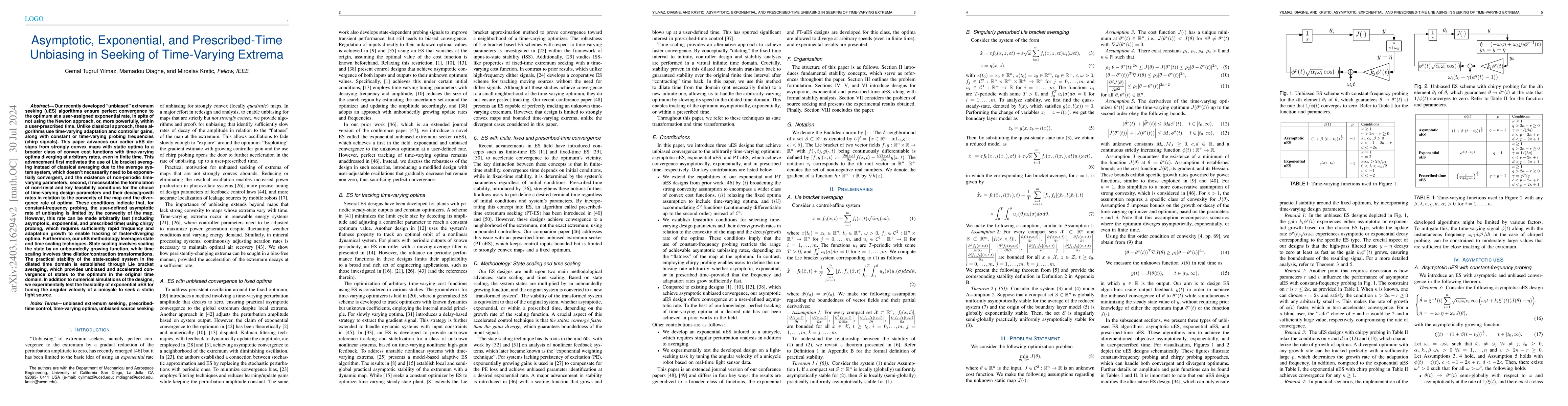 Extremum seeking is an online, model-free optimization algorithm traditionally known for its practical stability. This paper introduces an extremum seeking algorithm designed for unbiased convergence to the extremum asymptotically, allowing users to define the convergence rate. Unlike conventional extremum seeking approaches utilizing constant gains, our algorithms employ time-varying parameters. These parameters reduce perturbation amplitudes towards zero in an asymptotic manner, while incorporating asymptotically growing controller gains. The stability analysis is based on state transformation, achieved through the multiplication of the input state by asymptotic growth function, and Lie bracket averaging applied to the transformed system. The averaging ensures the practical stability of the transformed system, which, in turn, leads to the asymptotic stability of the original system. Moreover, for strongly convex maps, we achieve exponentially fast convergence. The numerical simulations validate the feasibility of the introduced designs.