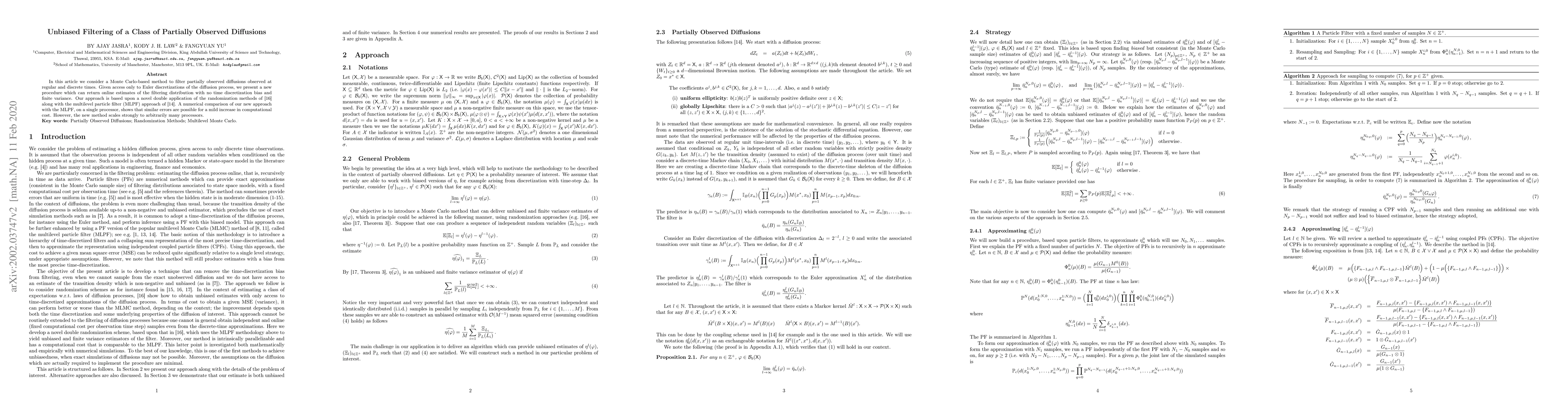 This paper introduces a Monte Carlo-based filtering method for partially observed diffusions, utilizing a double randomization approach and multilevel particle filtering. The new method achieves unbiased estimates with finite variance, demonstrating comparable accuracy to existing techniques but with better scalability to multiple processors.