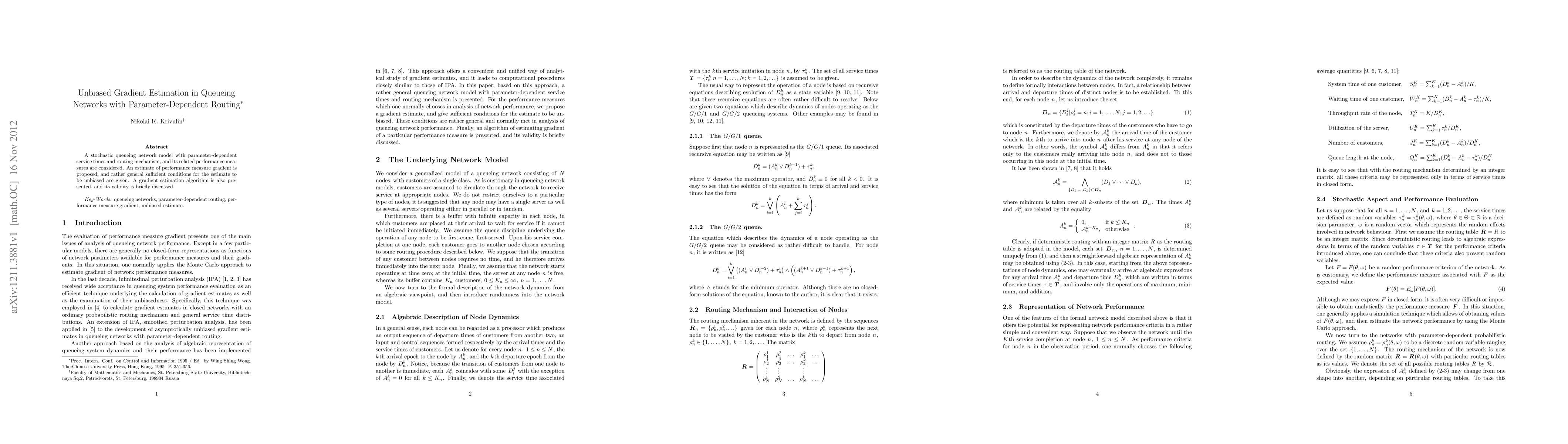 A stochastic queueing network model with parameter-dependent service times and routing mechanism, and its related performance measures are considered. An estimate of performance measure gradient is proposed, and rather general sufficient conditions for the estimate to be unbiased are given. A gradient estimation algorithm is also presented, and its validity is briefly discussed.