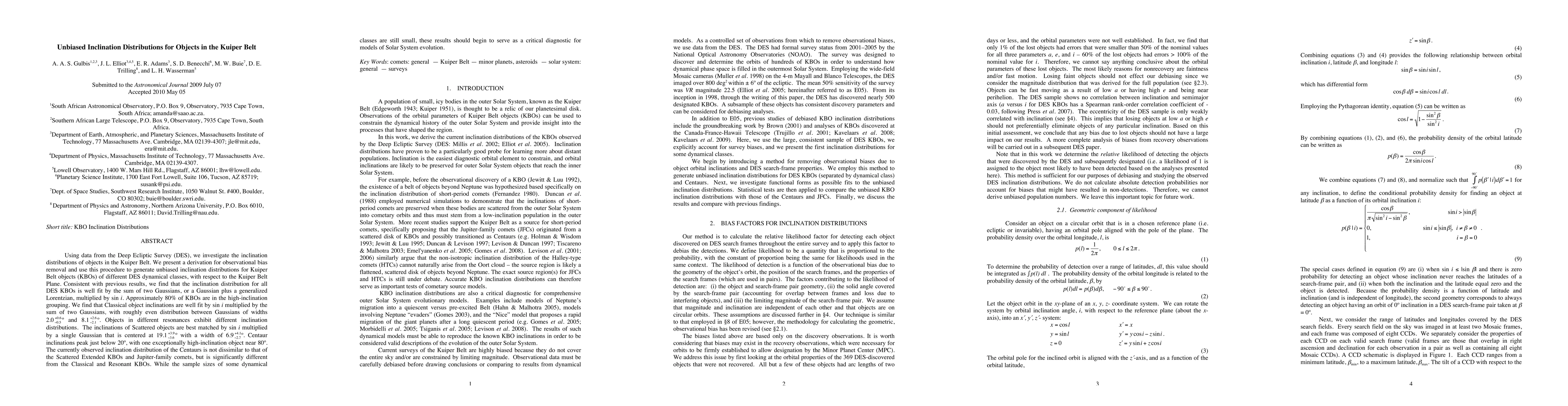 This study uses Deep Ecliptic Survey data to derive unbiased inclination distributions for Kuiper Belt objects, revealing that 80% are in high-inclination groups. Classical KBOs show a bimodal distribution, while Scattered objects have a Gaussian distribution centered at 19.1 degrees with a width of 6.9 degrees.