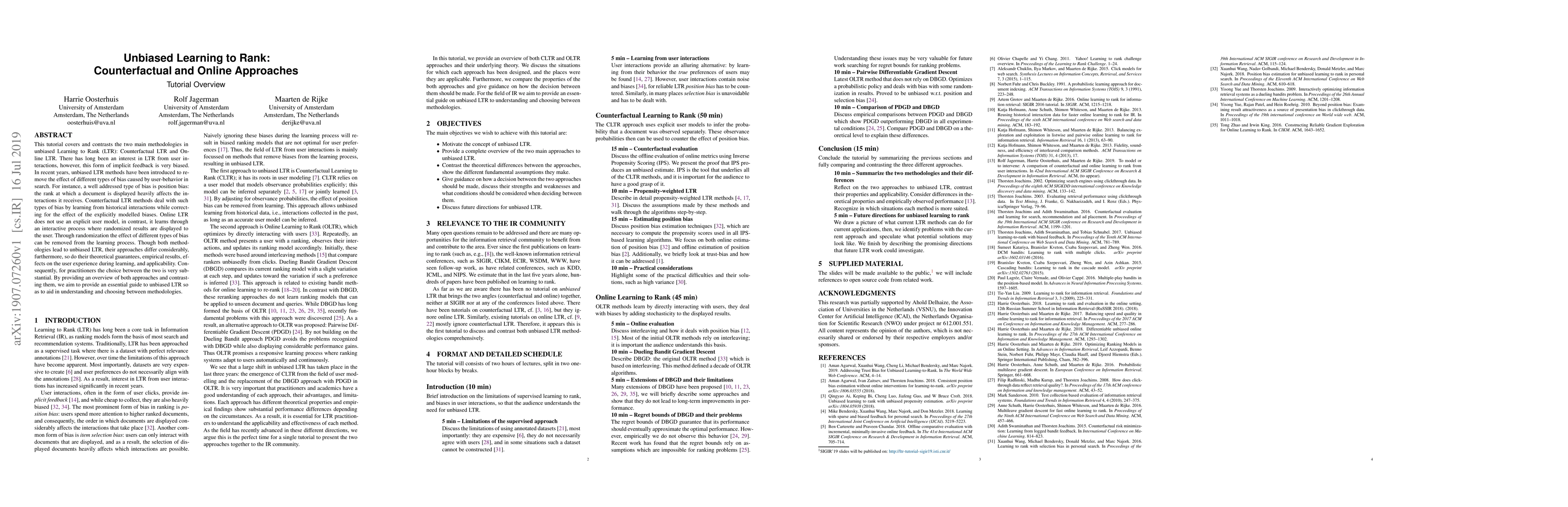 This tutorial covers and contrasts the two main methodologies in unbiased Learning to Rank (LTR): Counterfactual LTR and Online LTR. There has long been an interest in LTR from user interactions, however, this form of implicit feedback is very biased. In recent years, unbiased LTR methods have been introduced to remove the effect of different types of bias caused by user-behavior in search. For instance, a well addressed type of bias is position bias: the rank at which a document is displayed heavily affects the interactions it receives. Counterfactual LTR methods deal with such types of bias by learning from historical interactions while correcting for the effect of the explicitly modelled biases. Online LTR does not use an explicit user model, in contrast, it learns through an interactive process where randomized results are displayed to the user. Through randomization the effect of different types of bias can be removed from the learning process. Though both methodologies lead to unbiased LTR, their approaches differ considerably, furthermore, so do their theoretical guarantees, empirical results, effects on the user experience during learning, and applicability. Consequently, for practitioners the choice between the two is very substantial. By providing an overview of both approaches and contrasting them, we aim to provide an essential guide to unbiased LTR so as to aid in understanding and choosing between methodologies.