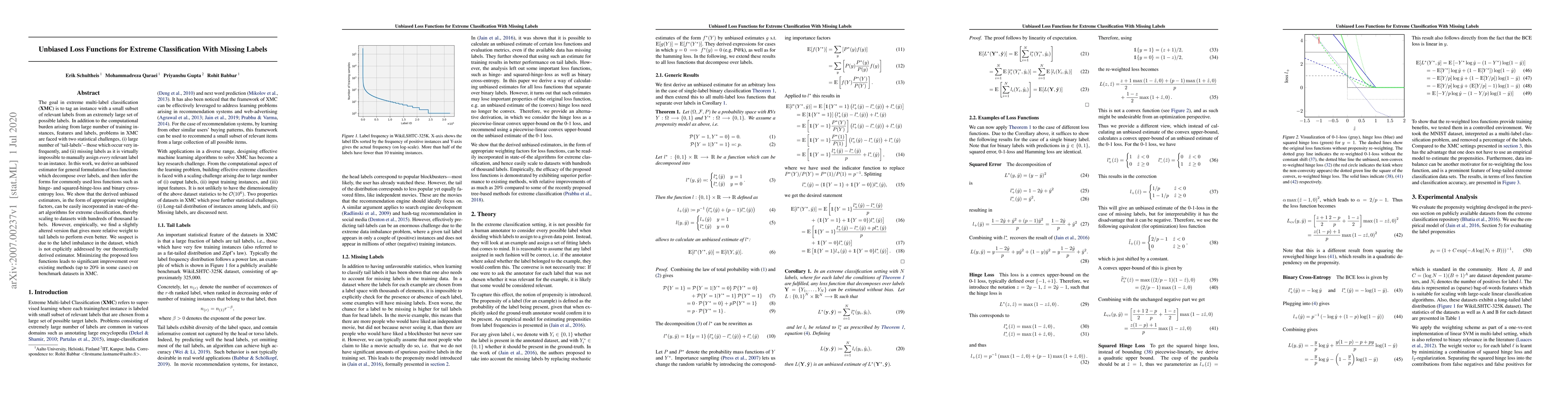 This paper proposes unbiased loss functions for extreme multi-label classification, addressing the challenges of tail labels and missing labels. The derived estimators improve state-of-the-art algorithms, with a modified version giving better performance by weighting tail labels more, leading to up to 20% improvement on benchmark datasets.