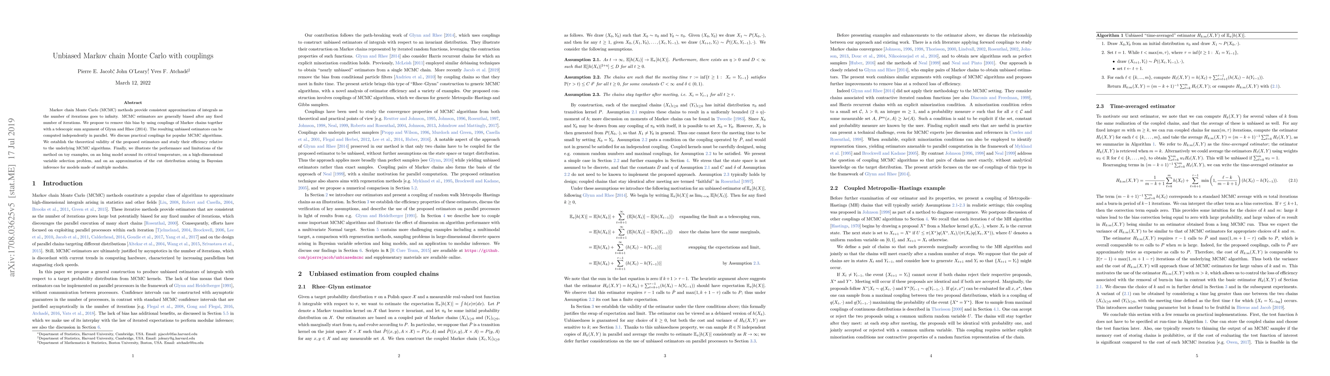 This paper proposes an unbiased Markov chain Monte Carlo (MCMC) method using couplings to eliminate bias, leveraging a telescopic sum argument. The method allows for independent computation and is theoretically validated, with practical applications demonstrated on various models.