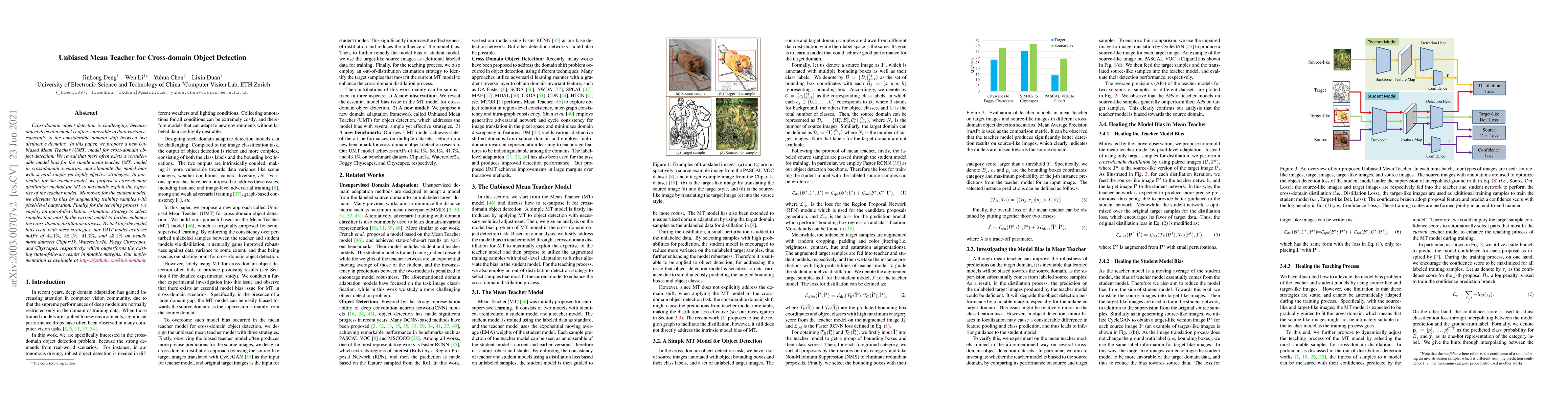 This paper introduces the Unbiased Mean Teacher (UMT) model to improve cross-domain object detection by addressing model bias issues inherent in the standard mean teacher approach. The UMT model employs cross-domain distillation, pixel-level adaptation for training samples, and out-of-distribution estimation to enhance performance, achieving superior mAP results across multiple benchmark datasets.