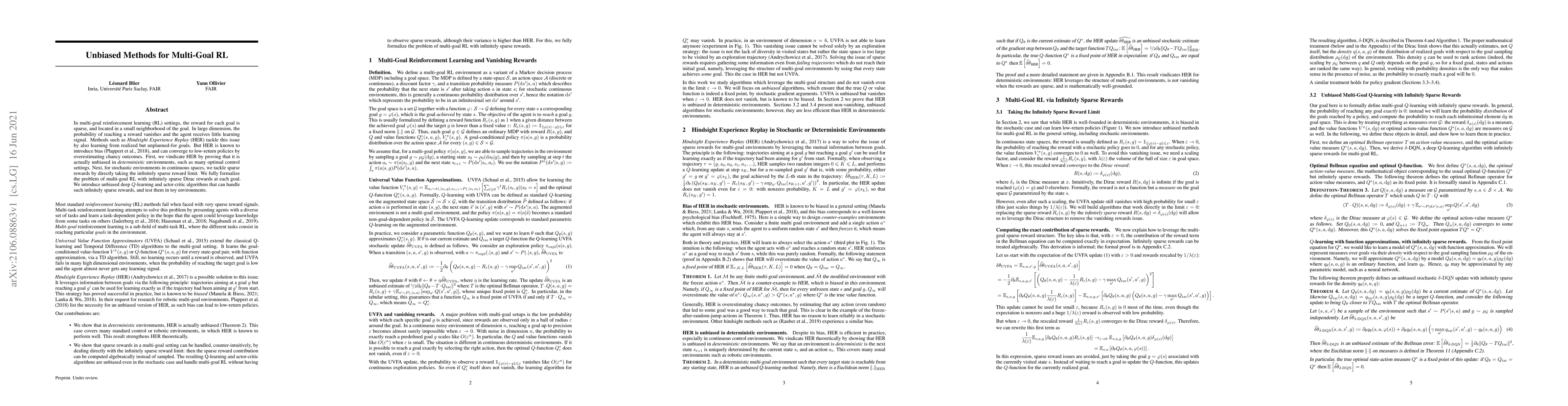 This paper addresses the challenge of sparse rewards in multi-goal reinforcement learning by introducing unbiased deep Q-learning and actor-critic algorithms. It proves that Hindsight Experience Replay is unbiased in deterministic environments and proposes new methods for stochastic environments with infinitely sparse rewards.