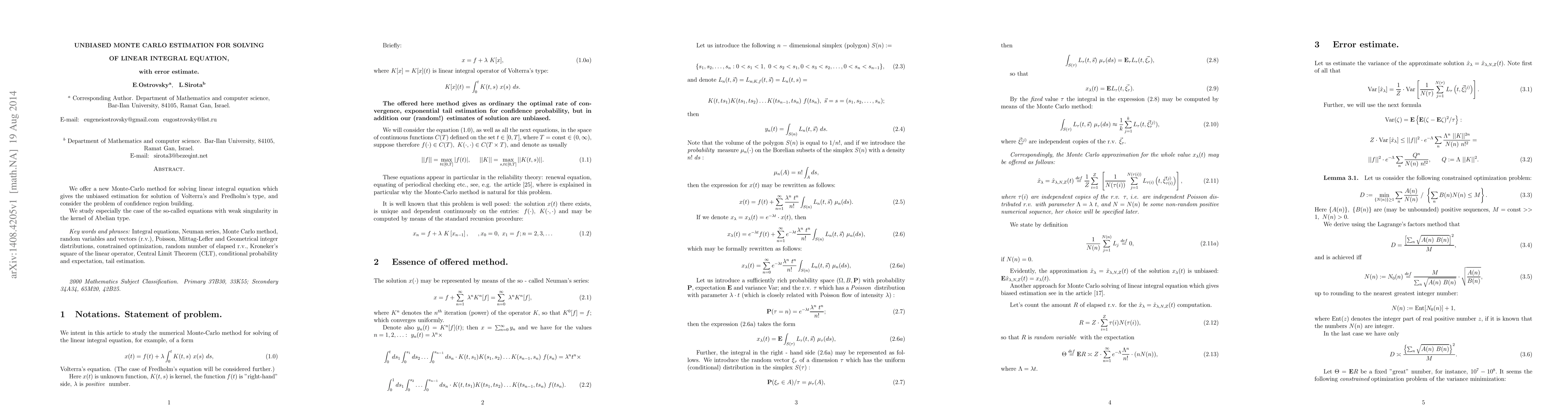 This paper introduces a novel Monte Carlo method for solving linear integral equations, providing unbiased estimations for both Volterra and Fredholm types, and discusses the construction of confidence regions, particularly focusing on equations with weakly singular kernels of Abelian type.