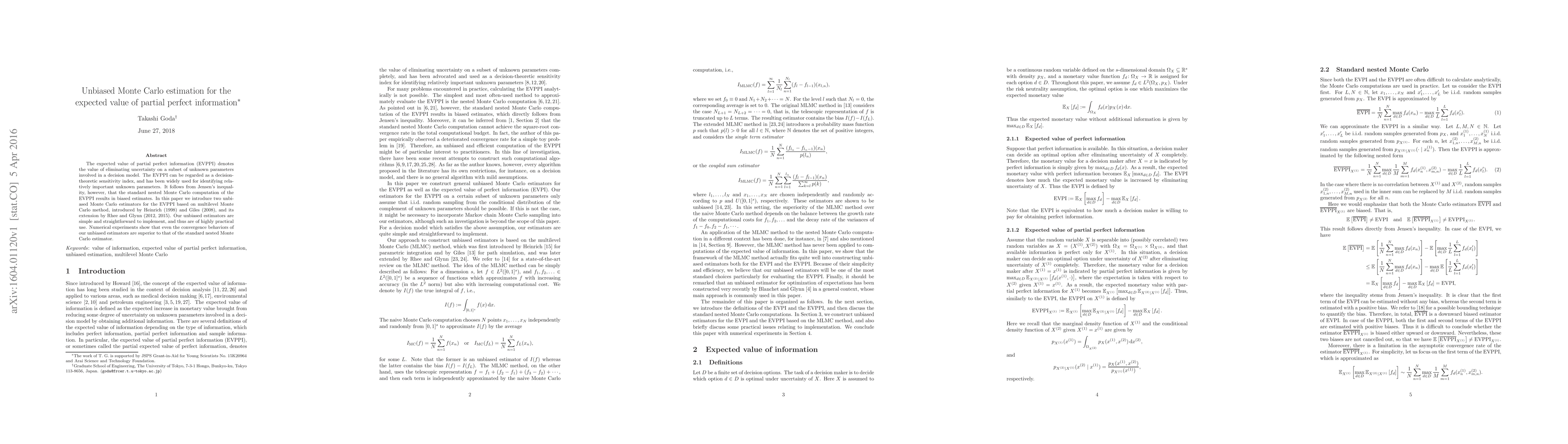 This paper introduces unbiased Monte Carlo estimators for the expected value of partial perfect information (EVPPI) using multilevel Monte Carlo methods. The proposed estimators outperform standard nested Monte Carlo estimates in both simplicity and convergence behavior.