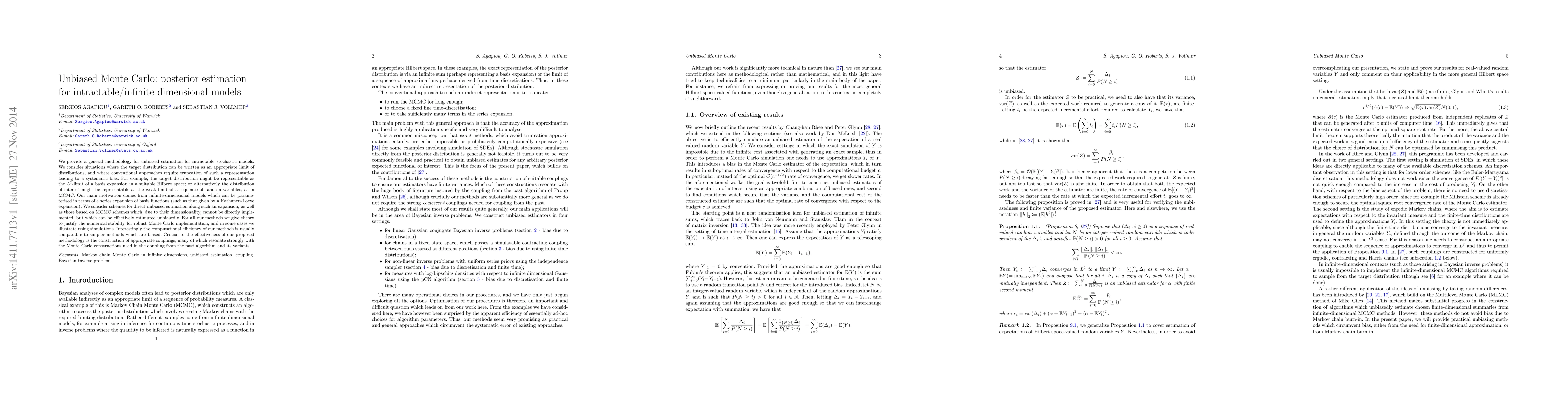 We provide a general methodology for unbiased estimation for intractable stochastic models. We consider situations where the target distribution can be written as an appropriate limit of distributions, and where conventional approaches require truncation of such a representation leading to a systematic bias. For example, the target distribution might be representable as the $L^2$-limit of a basis expansion in a suitable Hilbert space; or alternatively the distribution of interest might be representable as the weak limit of a sequence of random variables, as in MCMC. Our main motivation comes from infinite-dimensional models which can be parame- terised in terms of a series expansion of basis functions (such as that given by a Karhunen-Loeve expansion). We consider schemes for direct unbiased estimation along such an expansion, as well as those based on MCMC schemes which, due to their dimensionality, cannot be directly imple- mented, but which can be effectively estimated unbiasedly. For all our methods we give theory to justify the numerical stability for robust Monte Carlo implementation, and in some cases we illustrate using simulations. Interestingly the computational efficiency of our methods is usually comparable to simpler methods which are biased. Crucial to the effectiveness of our proposed methodology is the construction of appropriate couplings, many of which resonate strongly with the Monte Carlo constructions used in the coupling from the past algorithm and its variants.