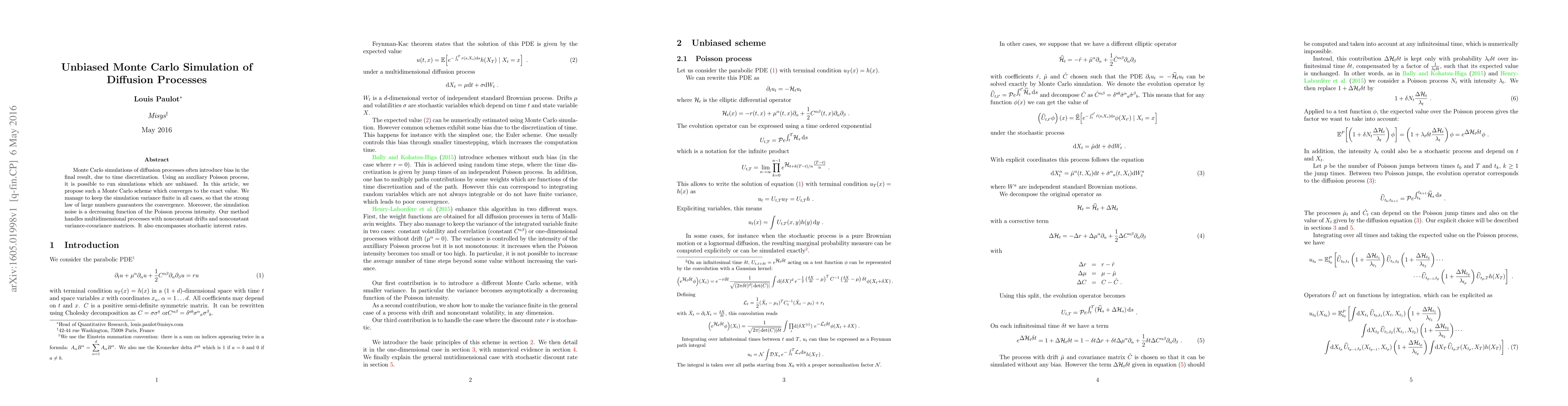 Monte Carlo simulations of diffusion processes often introduce bias in the final result, due to time discretization. Using an auxiliary Poisson process, it is possible to run simulations which are unbiased. In this article, we propose such a Monte Carlo scheme which converges to the exact value. We manage to keep the simulation variance finite in all cases, so that the strong law of large numbers guarantees the convergence. Moreover, the simulation noise is a decreasing function of the Poisson process intensity. Our method handles multidimensional processes with nonconstant drifts and nonconstant variance-covariance matrices. It also encompasses stochastic interest rates.