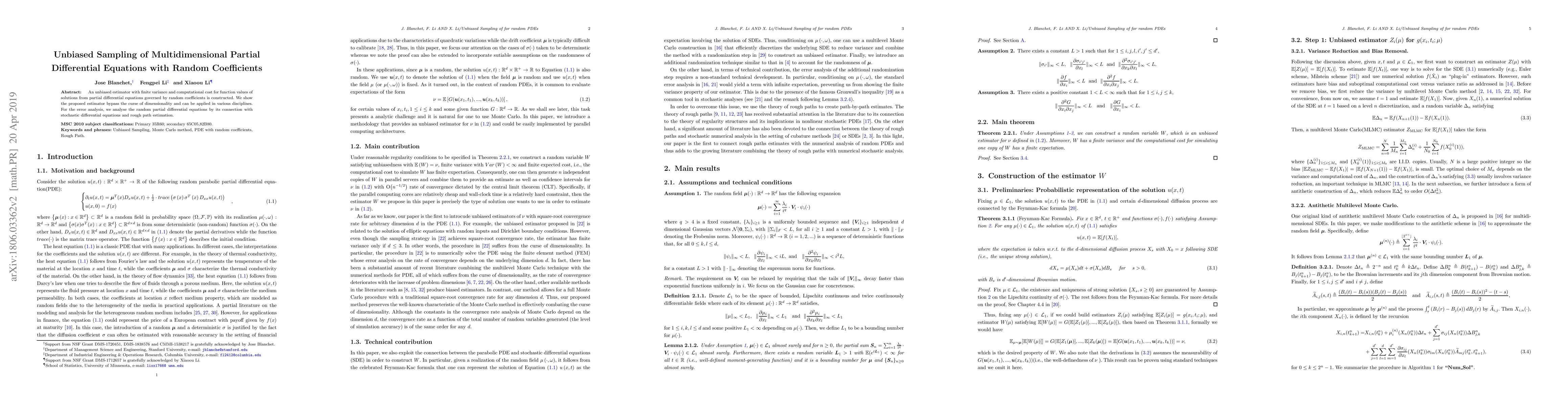 This paper develops an unbiased estimator for solutions of PDEs with random coefficients, demonstrating finite variance and computational cost, and showing its applicability across different dimensions and disciplines through rough path estimation techniques.