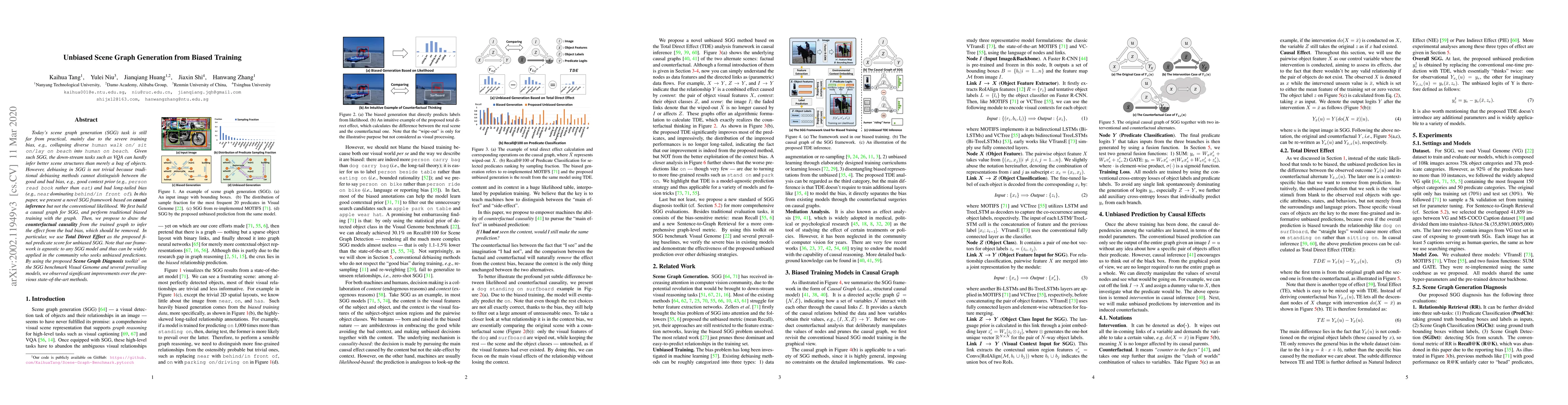 Today's scene graph generation (SGG) task is still far from practical, mainly due to the severe training bias, e.g., collapsing diverse "human walk on / sit on / lay on beach" into "human on beach". Given such SGG, the down-stream tasks such as VQA can hardly infer better scene structures than merely a bag of objects. However, debiasing in SGG is not trivial because traditional debiasing methods cannot distinguish between the good and bad bias, e.g., good context prior (e.g., "person read book" rather than "eat") and bad long-tailed bias (e.g., "near" dominating "behind / in front of"). In this paper, we present a novel SGG framework based on causal inference but not the conventional likelihood. We first build a causal graph for SGG, and perform traditional biased training with the graph. Then, we propose to draw the counterfactual causality from the trained graph to infer the effect from the bad bias, which should be removed. In particular, we use Total Direct Effect (TDE) as the proposed final predicate score for unbiased SGG. Note that our framework is agnostic to any SGG model and thus can be widely applied in the community who seeks unbiased predictions. By using the proposed Scene Graph Diagnosis toolkit on the SGG benchmark Visual Genome and several prevailing models, we observed significant improvements over the previous state-of-the-art methods.