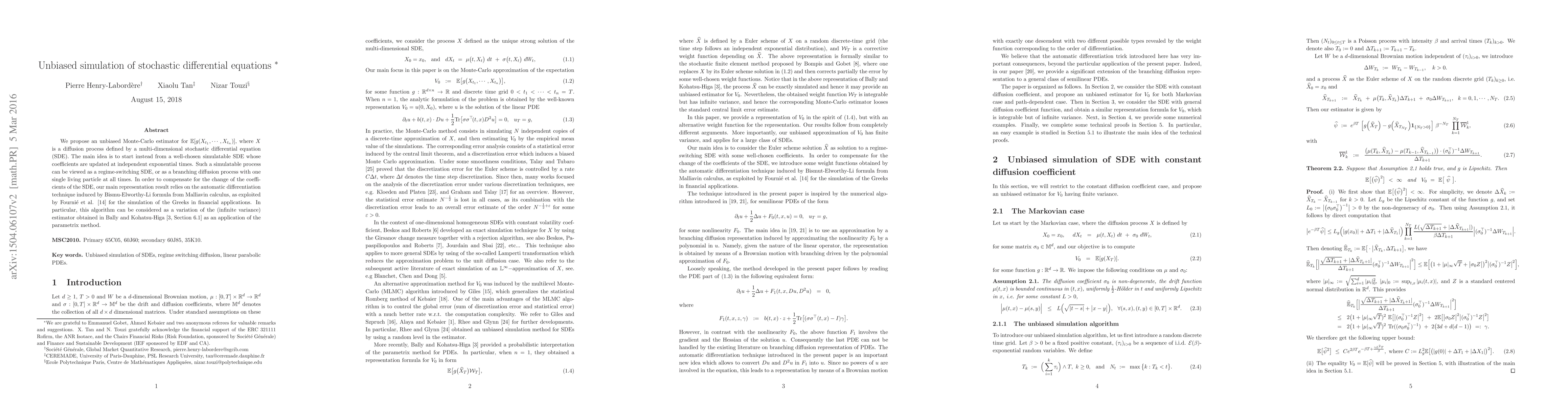 We propose an unbiased Monte-Carlo estimator for $\mathbb{E}[g(X_{t_1}, \cdots, X_{t_n})]$, where $X$ is a diffusion process defined by a multi-dimensional stochastic differential equation (SDE). The main idea is to start instead from a well-chosen simulatable SDE whose coefficients are updated at independent exponential times. Such a simulatable process can be viewed as a regime-switching SDE, or as a branching diffusion process with one single living particle at all times. In order to compensate for the change of the coefficients of the SDE, our main representation result relies on the automatic differentiation technique induced by Bismu-Elworthy-Li formula from Malliavin calculus, as exploited by Fourni\'e et al.(1999) for the simulation of the Greeks in financial applications. In particular, this algorithm can be considered as a variation of the (infinite variance) estimator obtained in Bally and Kohatsu-Higa [Section 6.1](2014) as an application of the parametrix method.