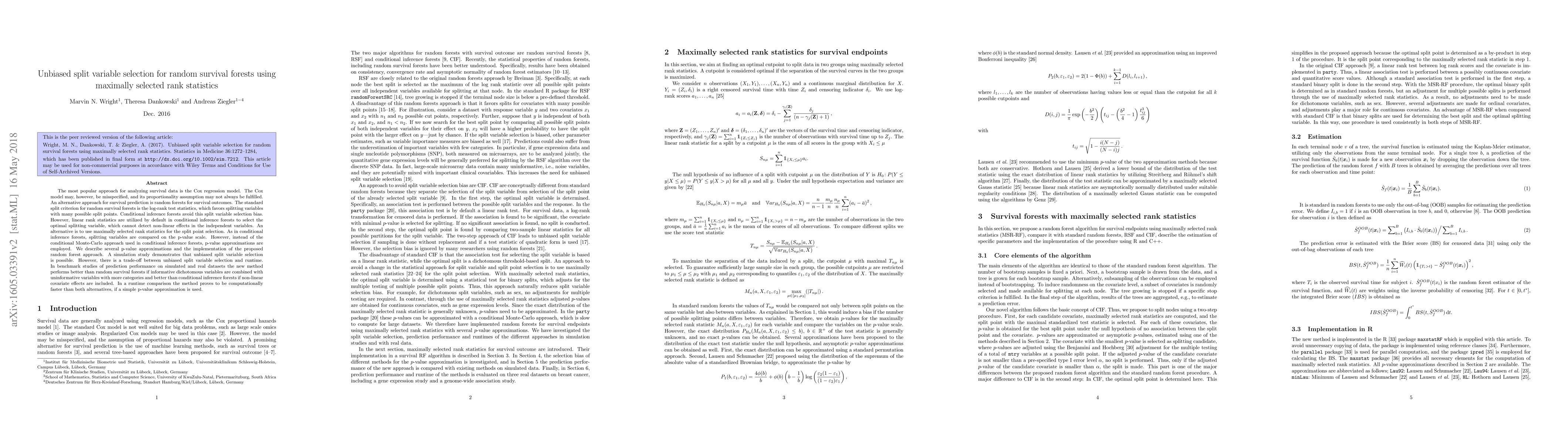 This paper proposes an unbiased split variable selection method for random survival forests using maximally selected rank statistics, demonstrating improved performance in the presence of informative dichotomous variables and non-linear effects, while being computationally faster than alternative methods. Simulation and benchmark studies show its effectiveness and efficiency trade-off.