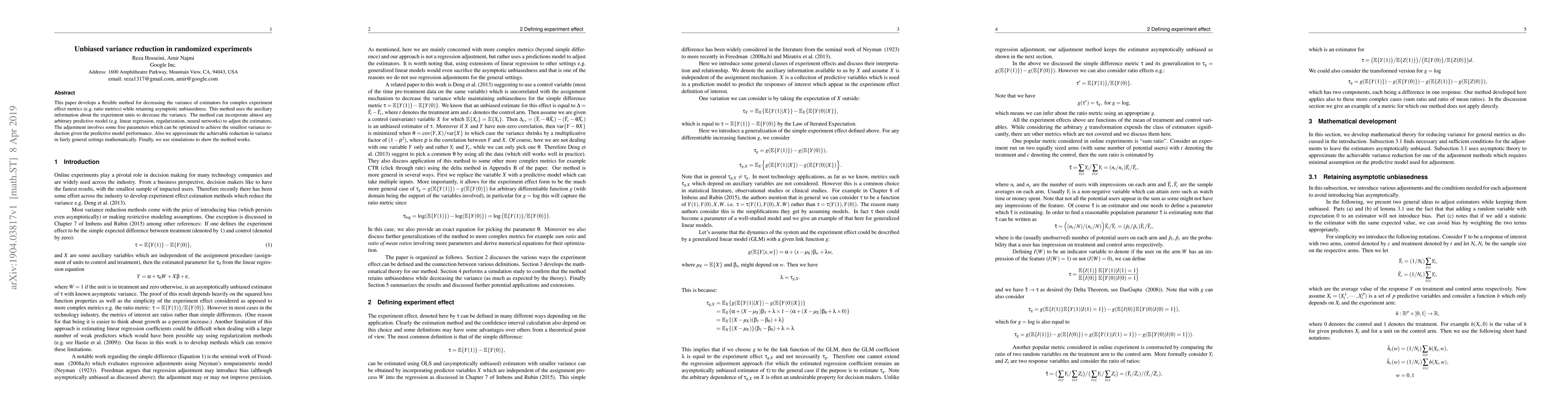 This paper develops a flexible method for decreasing the variance of estimators for complex experiment effect metrics (e.g. ratio metrics) while retaining asymptotic unbiasedness. This method uses the auxiliary information about the experiment units to decrease the variance. The method can incorporate almost any arbitrary predictive model (e.g. linear regression, regularization, neural networks) to adjust the estimators. The adjustment involves some free parameters which can be optimized to achieve the smallest variance reduction given the predictive model performance. Also we approximate the achievable reduction in variance in fairly general settings mathematically. Finally, we use simulations to show the method works.