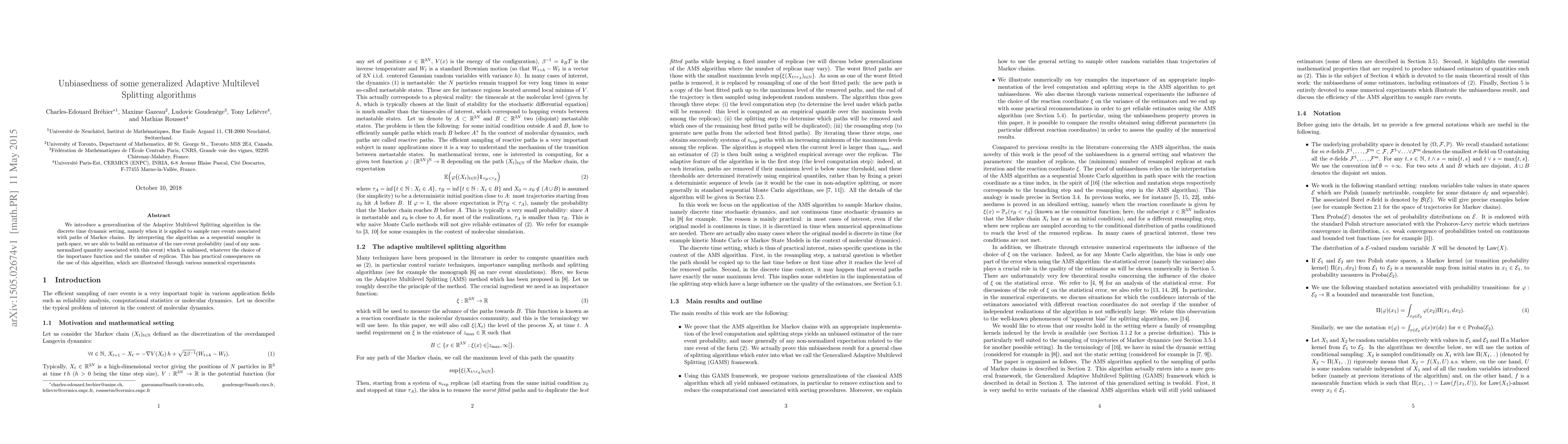 This paper generalizes the Adaptive Multilevel Splitting algorithm for rare event simulation in Markov chains, demonstrating that the resulting estimator remains unbiased regardless of the importance function and number of replicas, with practical implications shown through numerical experiments.