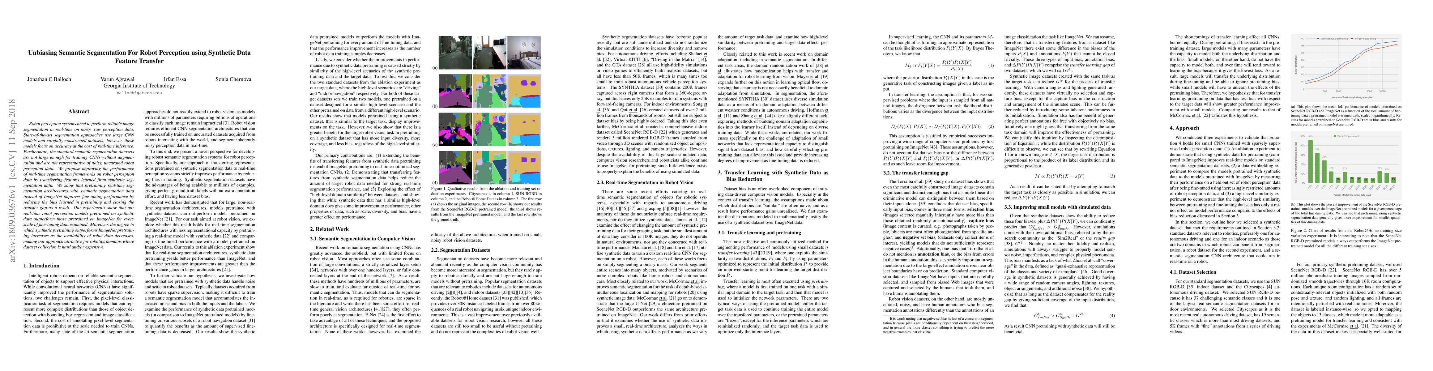 This paper proposes using synthetic data feature transfer to improve real-time semantic segmentation for robot perception systems. By pretraining segmentation models on synthetic data instead of ImageNet, the authors achieve better performance and reduced bias, especially when real robot data is scarce.